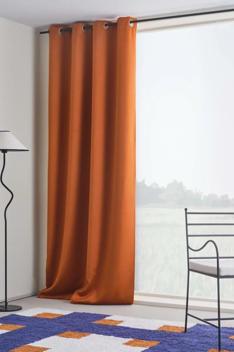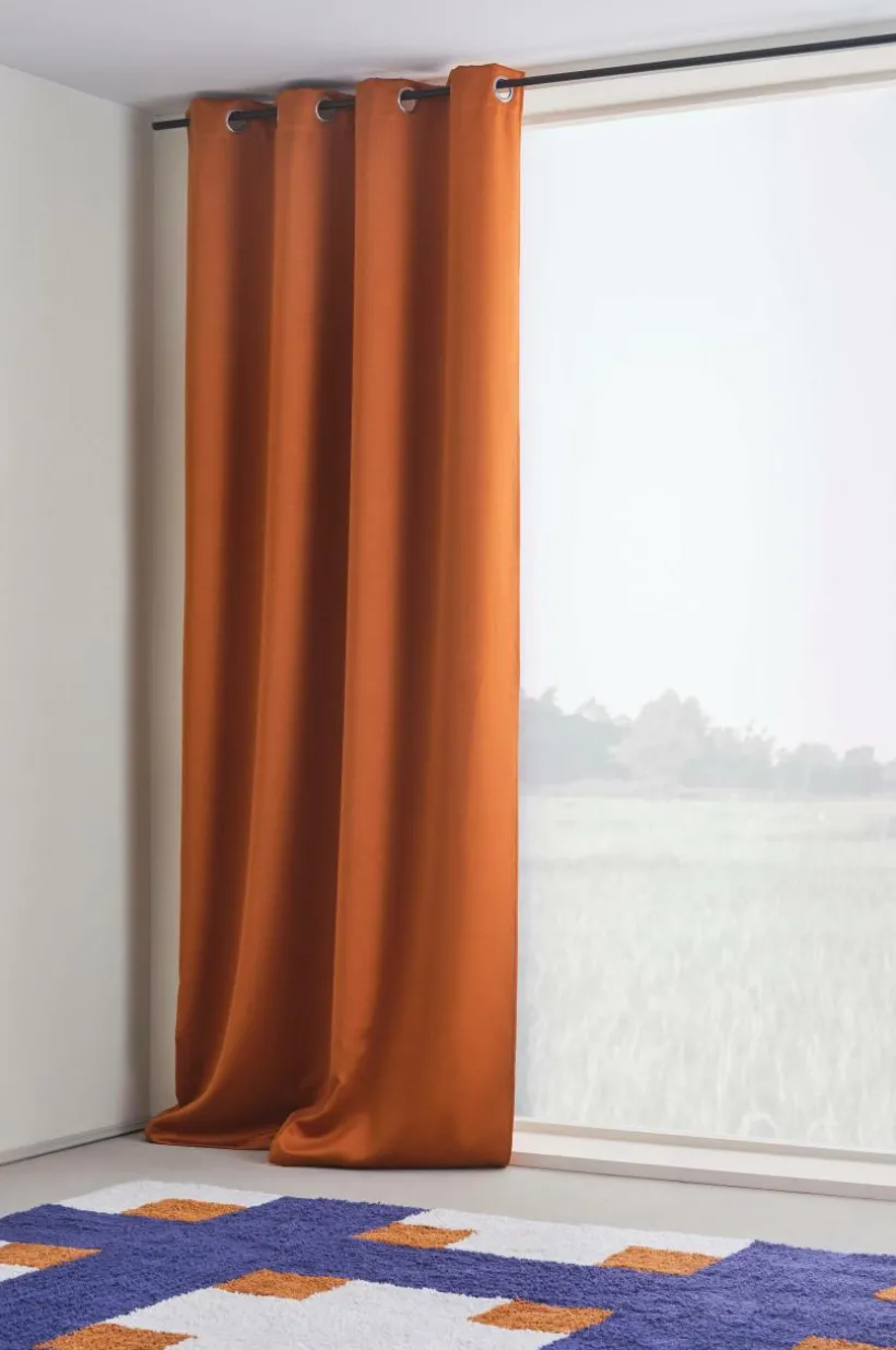 En öljettlängd för mörkläggning, tillverkad av polyester varav 60% kommer från återvunnet material. KYLIE är lika fin på baksidan som på framsidan. Gardinen är tätvävd så att beläggning på baksidan inte behövs. Var uppmärksam på att de olika färgerna varierar i mörkläggning och mörka färger är mörkläggande medan de ljusa är mer ljusdämpande. Åtta öljetter per längd som enkelt träs på en gardinstång. Gramvikt 240 g/m².