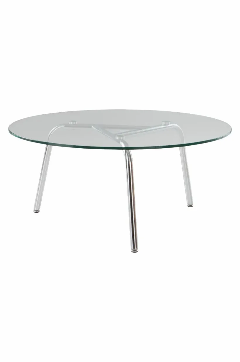Stilrent soffbord i kromat järn, toppat med en glasskiva som ger vardagsrummet en lyxig och luftig känsla. Bordet levereras omonterat. Glasskivan har fästen under som skruvas fast i benen/underredet. Viss montering krävs. Monteringsanvisning medföljer.