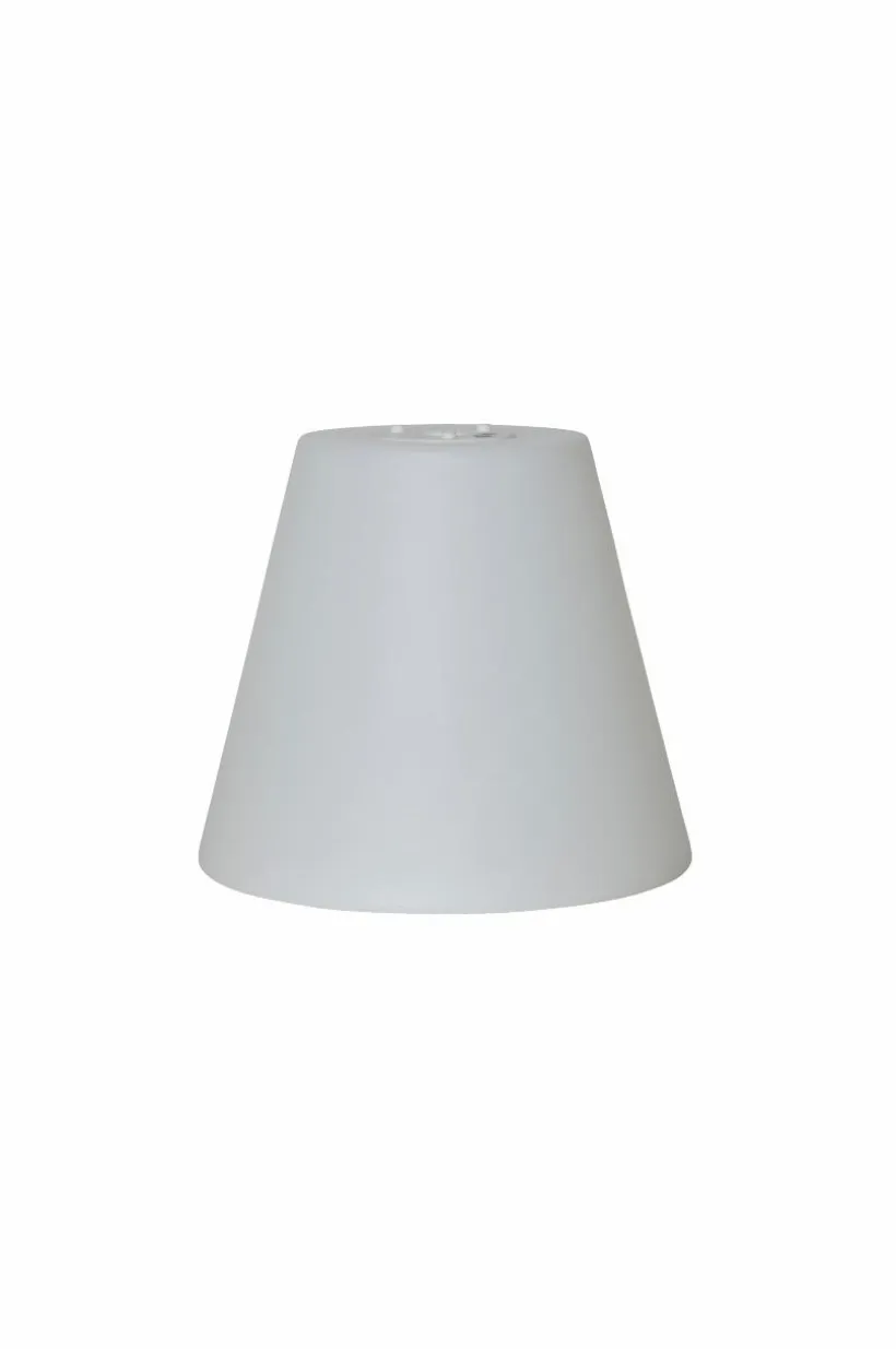 Lampskärm i vit textil för utomhusbruk.