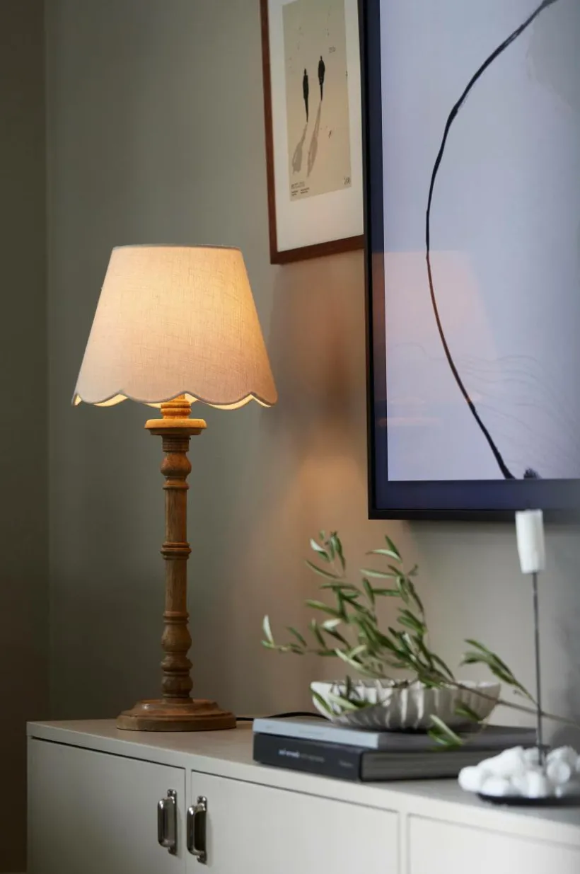 Jasmine är lampskärm i ett linnetyg med fin struktur. Skärmen är lätt utställd och har en vågad form nedtill. E27 fäste.