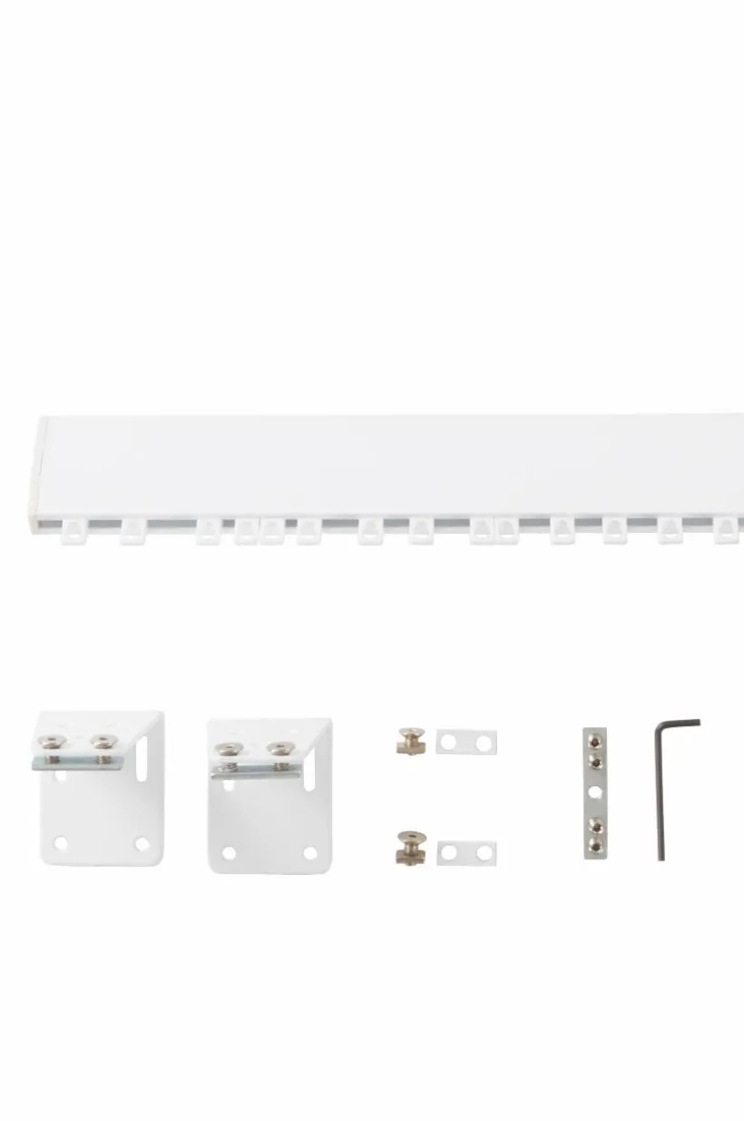I setet ingår 1 gardinskena, 2 takfästen, 2 väggfästen, 14 glid, 1 skarvdel och L-nyckel.