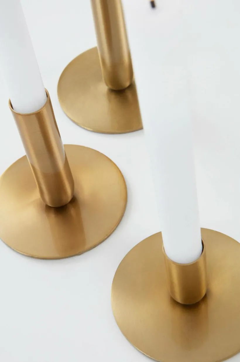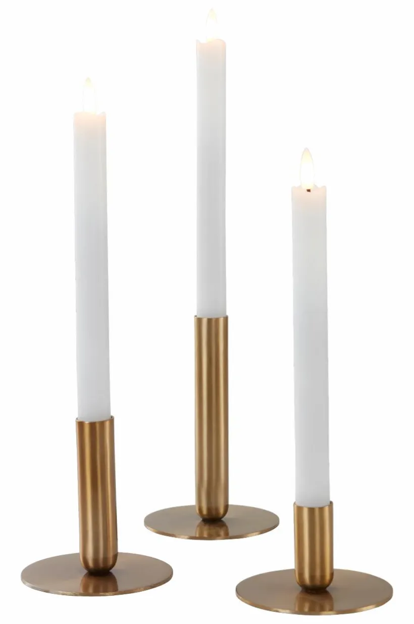 3-pack ljusstakar av järn. De tre ljusstakarna har samma form och varierande höjd. De svarta har pulverlackad matt yta.De guldfärgade har borstad finish. Ljusstakarna är fina både i grupp och att sprida ut längs till exempel bordets mitt. Ljus medföljer ej.