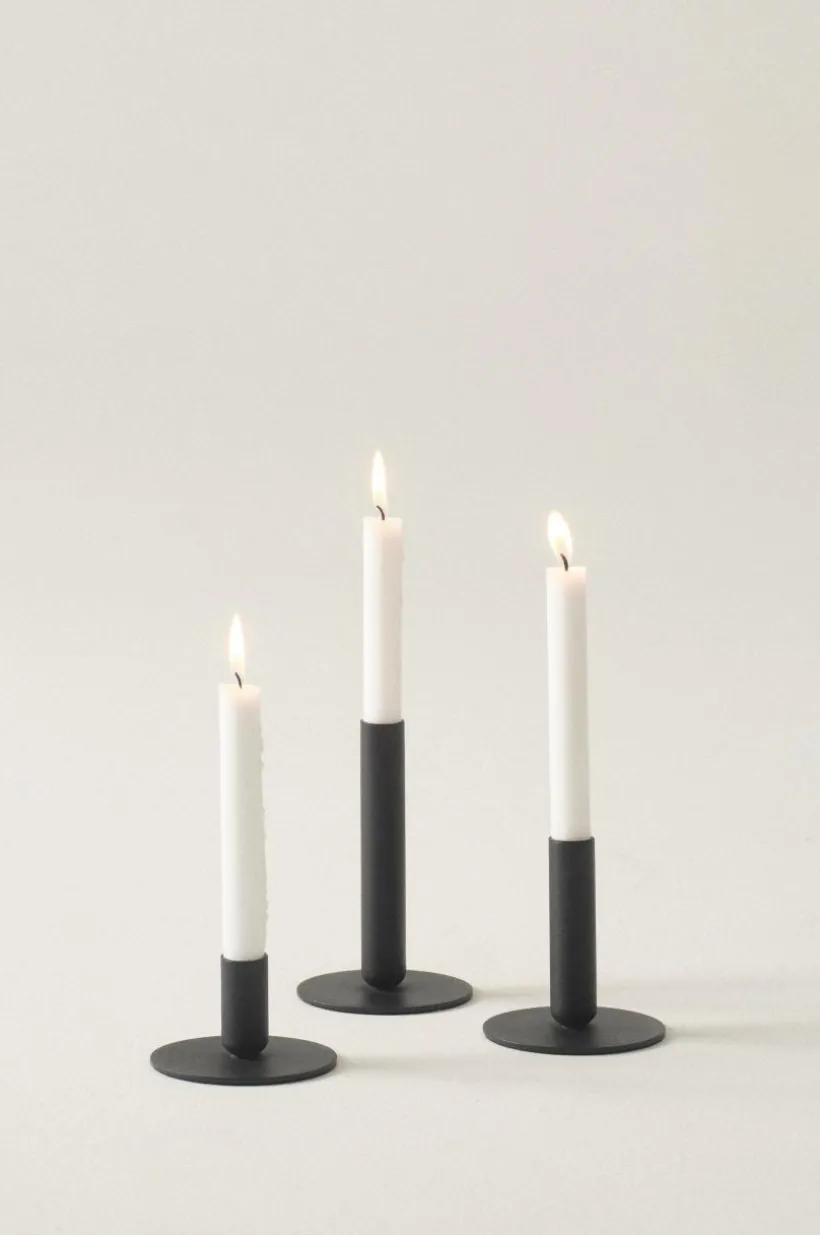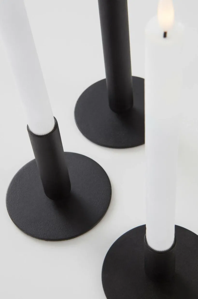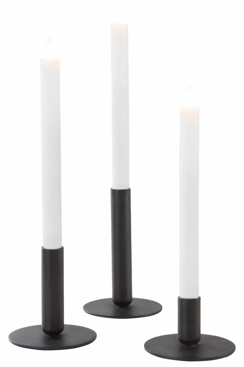 3-pack ljusstakar av järn. De tre ljusstakarna har samma form och varierande höjd. De svarta har pulverlackad matt yta.De guldfärgade har borstad finish. Ljusstakarna är fina både i grupp och att sprida ut längs till exempel bordets mitt. Ljus medföljer ej.