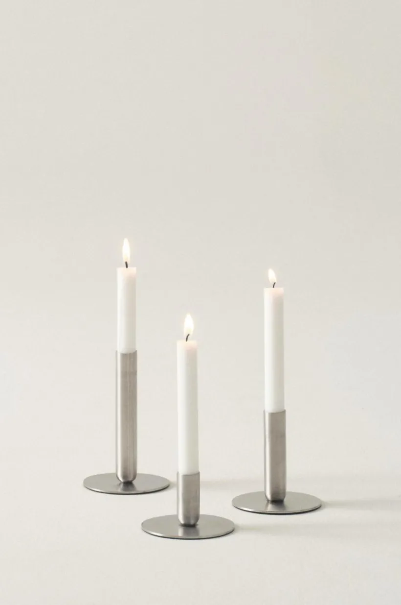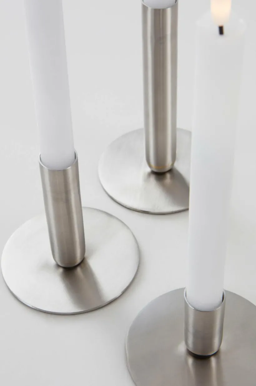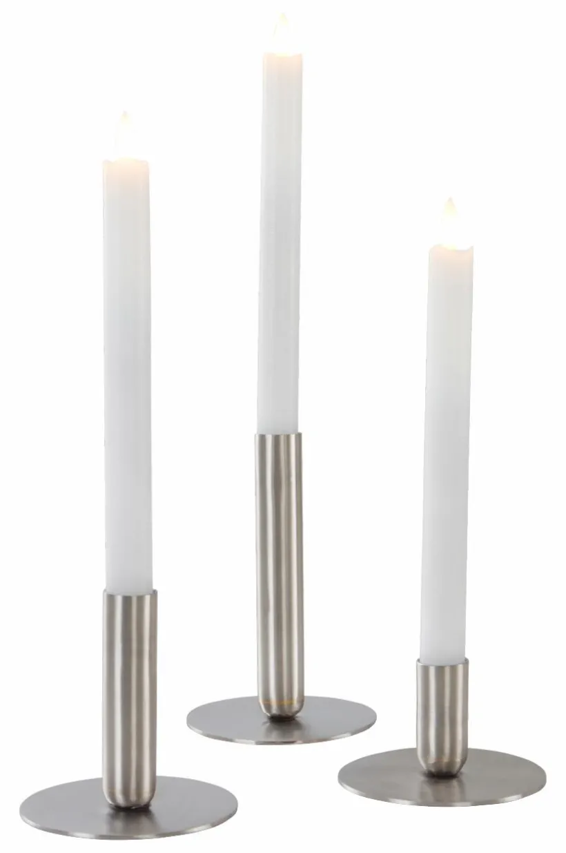3-pack ljusstakar av rostfritt stål. De tre ljusstakarna har samma form och varierande höjd. Ytan är borstad och polerad. Ljusstakarna är fina både i grupp och att sprida ut längs till exempel bordets mitt. Ljus medföljer ej.