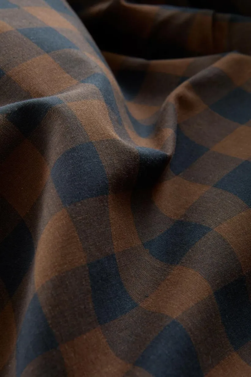 Det här tyget är garnfärgat. Ett garnfärgat tyg innebär att tråden färgas före vävningen, vilket gör att det vävda mönstret ser likadant ut på båda sidor av tyget.