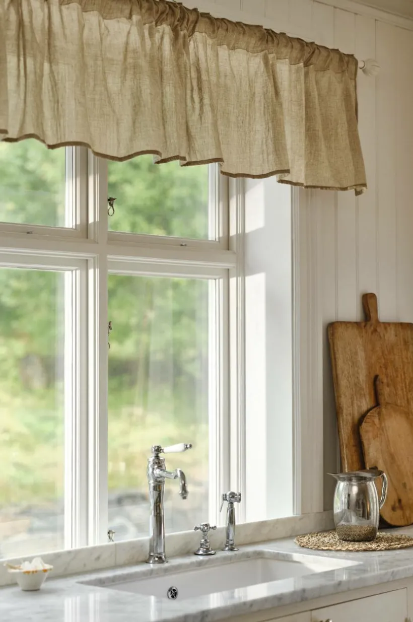 Gardinkappan från LAYER-familjen ger en elegant touch till köket eller vardagsrummet. Den skira designen är tillverkad av 50% återvunnen polyester och låter mjukt ljus filtrera igenom samtidigt som den ger lite avskildhet. Kombinera den med matchande gardiner från LAYER-kollektionen för en sammanhängande look.