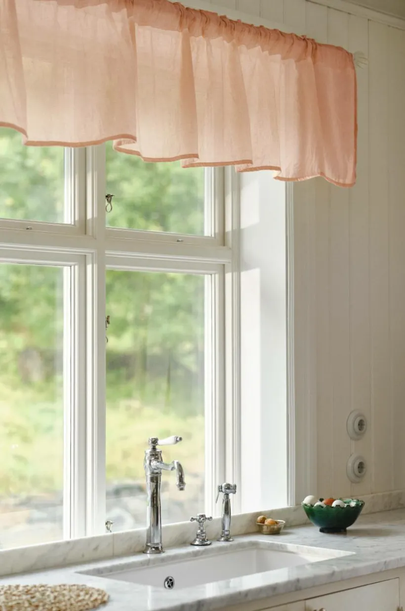 Gardinkappan från LAYER-familjen ger en elegant touch till köket eller vardagsrummet. Den skira designen är tillverkad av 50% återvunnen polyester och låter mjukt ljus filtrera igenom samtidigt som den ger lite avskildhet. Kombinera den med matchande gardiner från LAYER-kollektionen för en sammanhängande look.