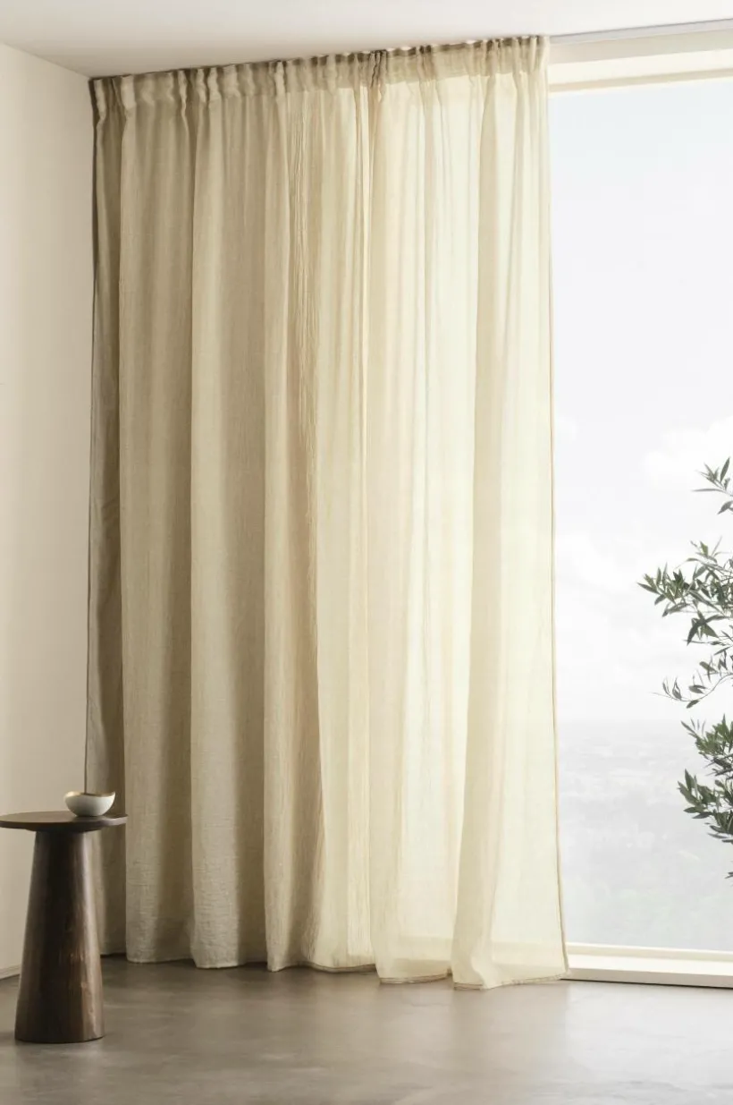 En extra bred gardinlängd i skir och luftig kvalité av polyester/bomull som faller lätt. Med påsytt multifunktionsband. Gardinen kan hängas upp med fingerkrokar, kanal samt dold hälla.