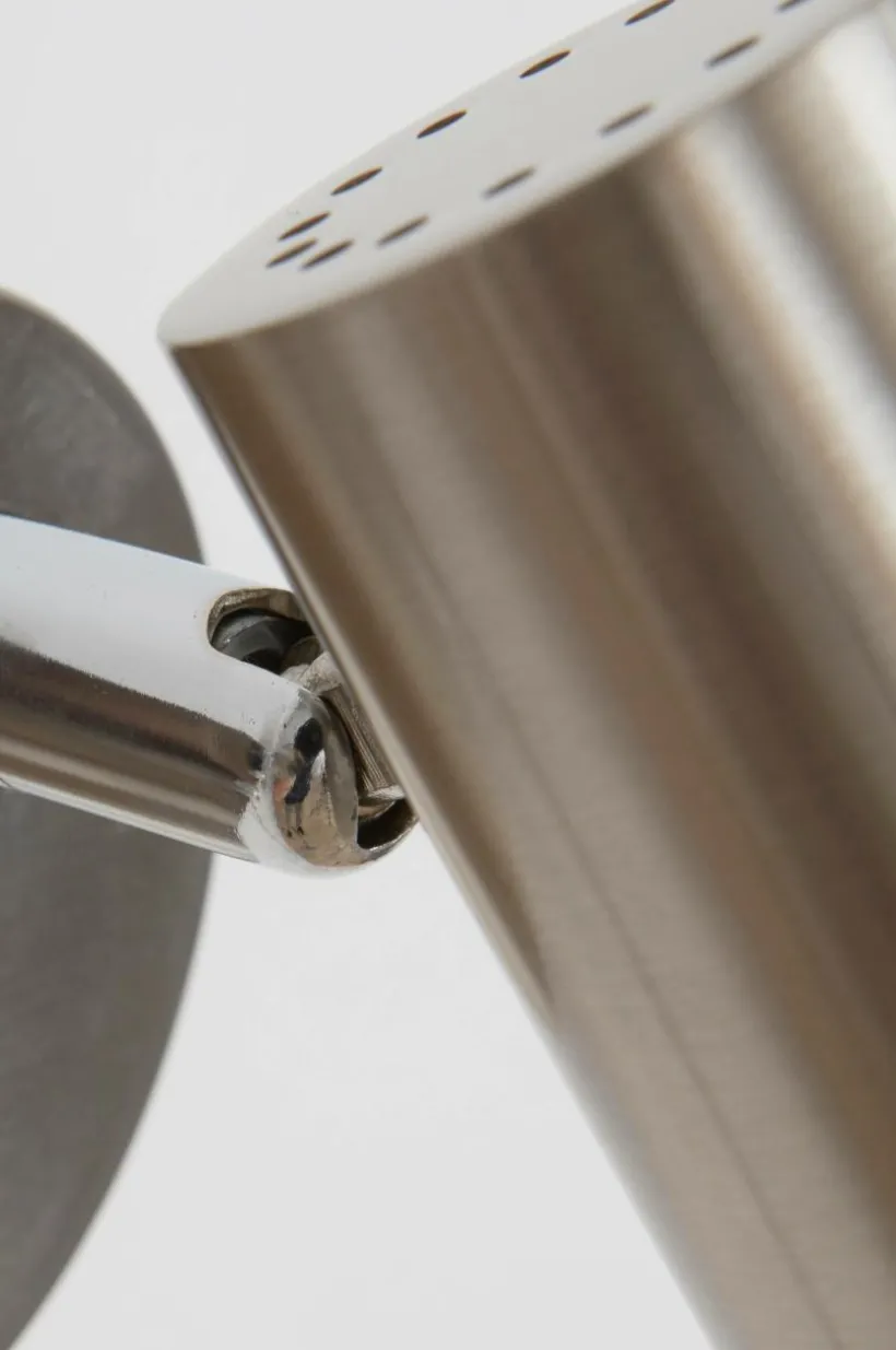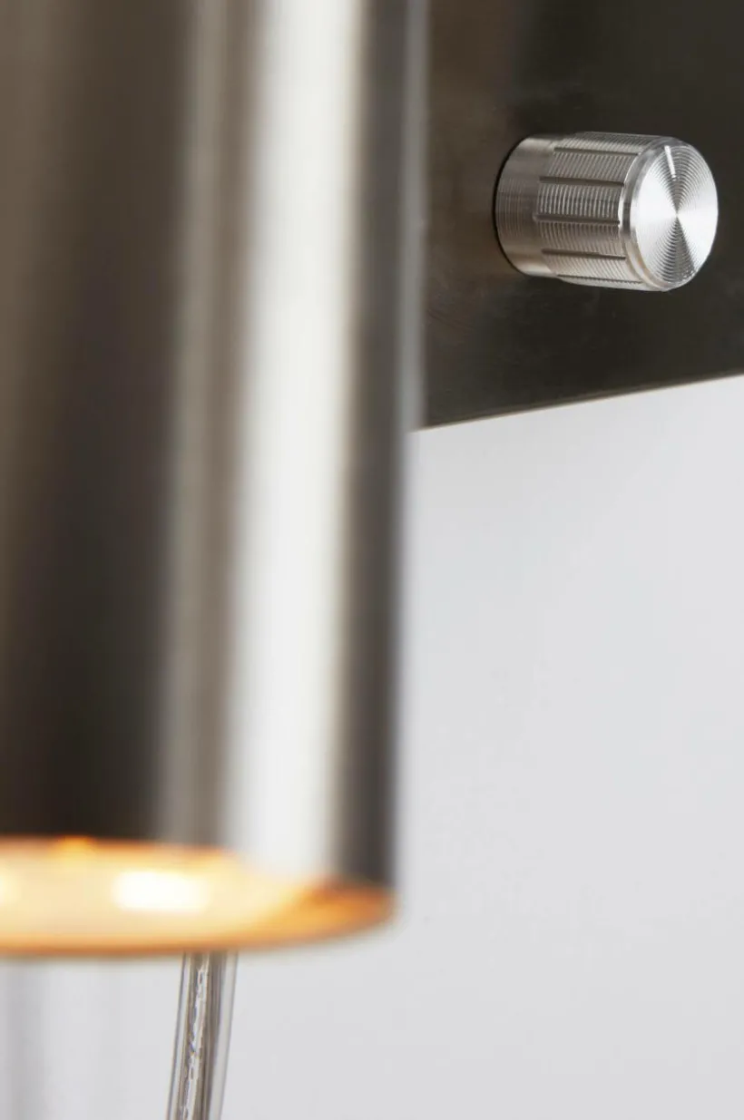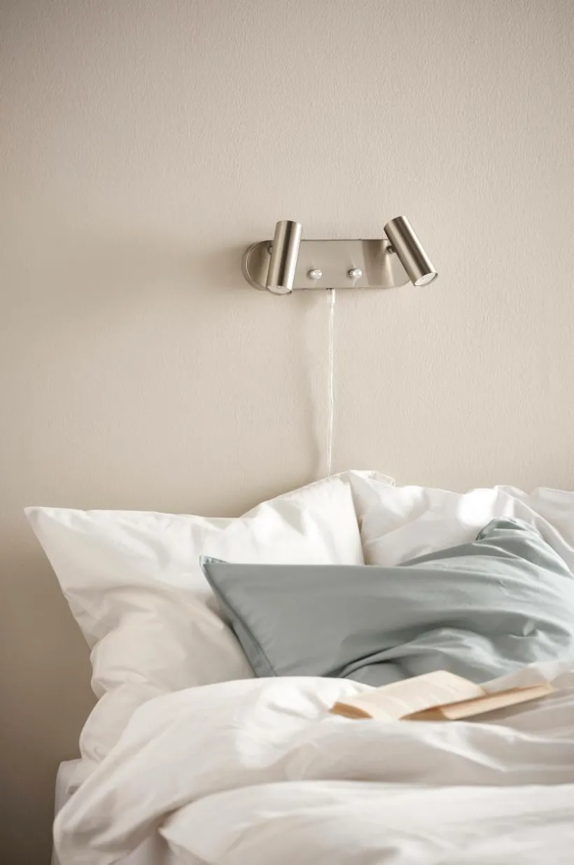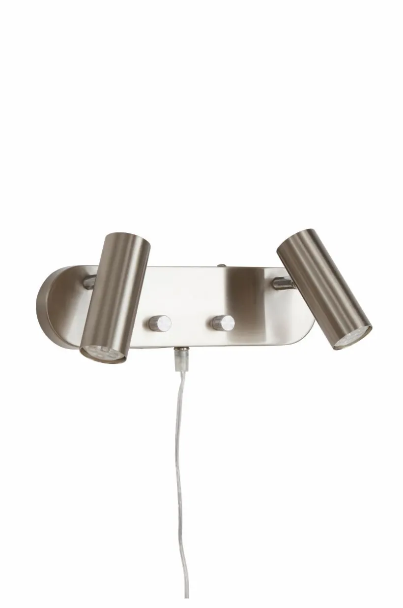 Vägglampa i metall inklusive LED-belysning. 2 st ställbara lamphuvuden med dimmer/strömbrytare på väggplattan. Enfärgad utsida och detaljer i krom. Transparent sladd i plast, 170 cm.