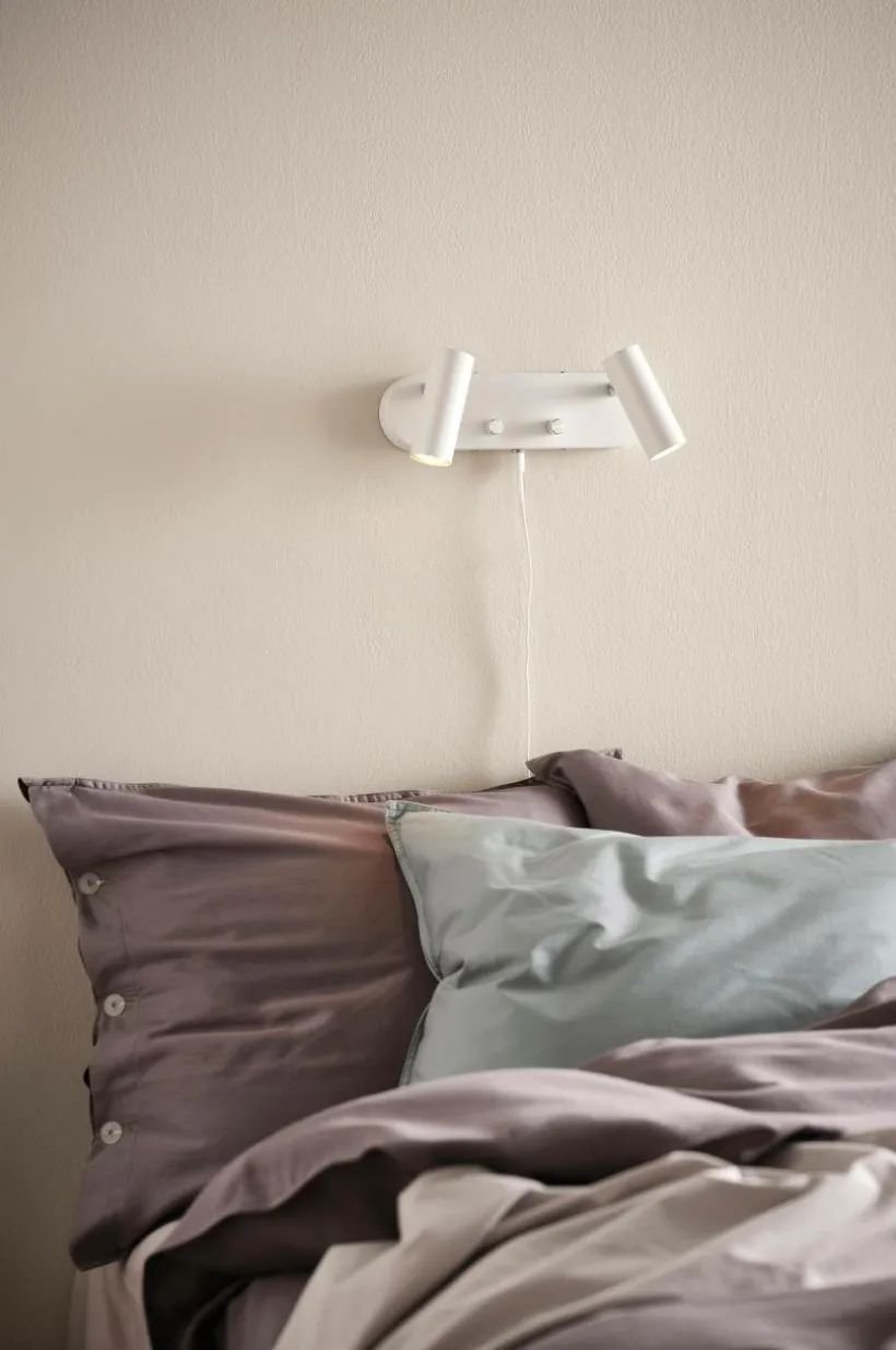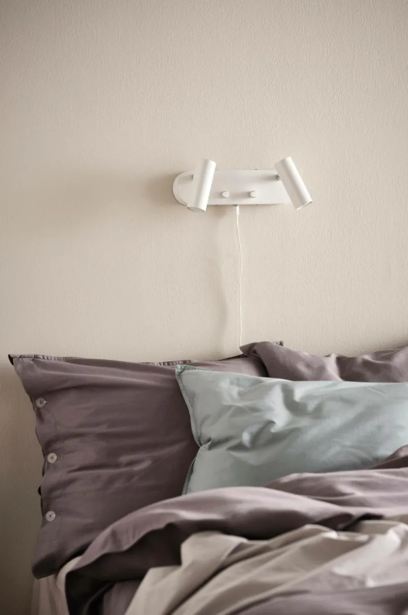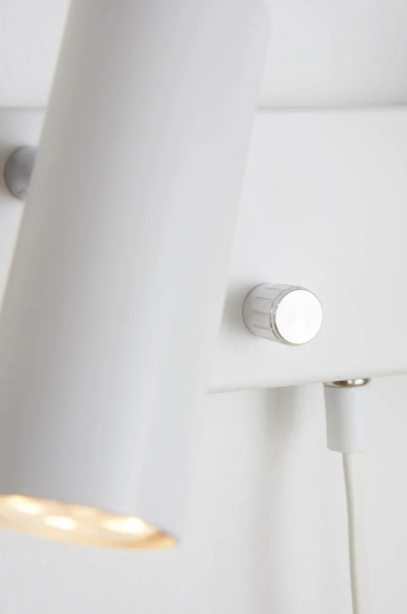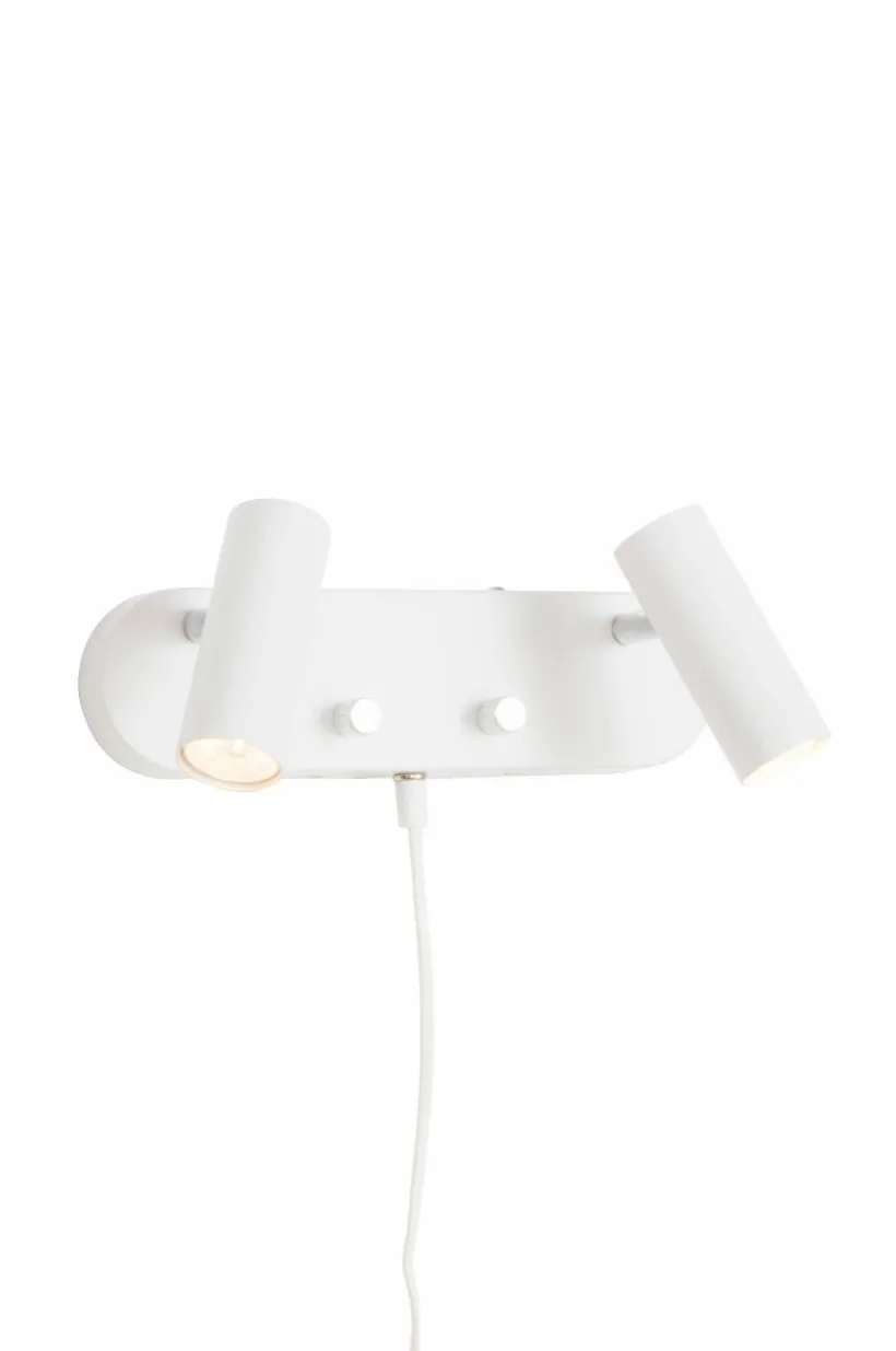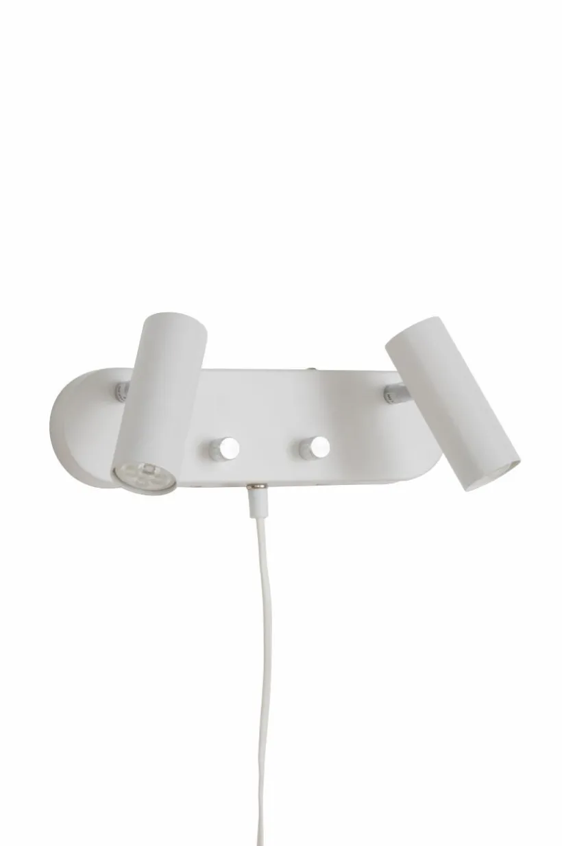 Vägglampa i metall inklusive LED-belysning. 2 st ställbara lamphuvuden med dimmer/strömbrytare på väggplattan. Enfärgad utsida och detaljer i krom. Transparent sladd i plast, 170 cm.