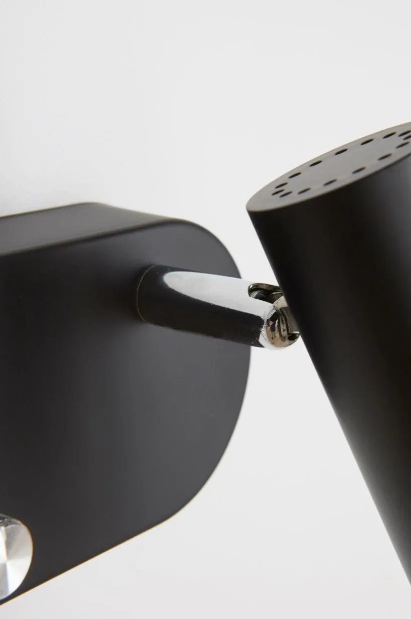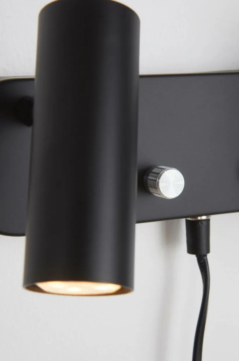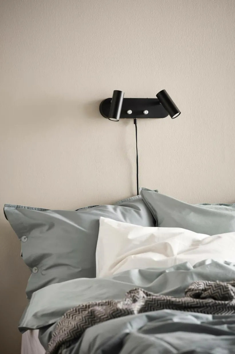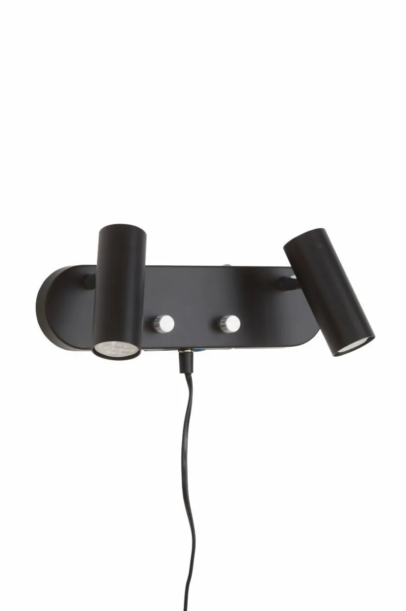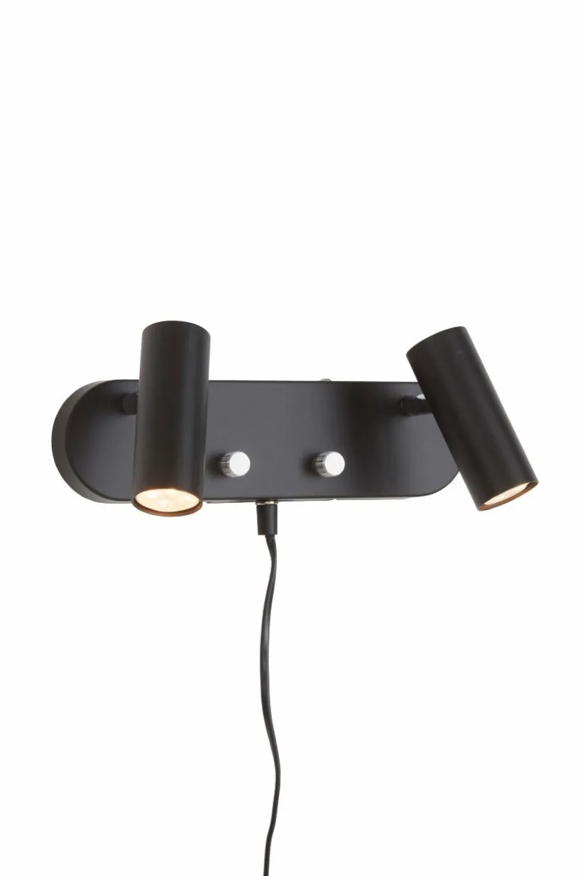 Vägglampa i metall inklusive LED-belysning. 2 st ställbara lamphuvuden med dimmer/strömbrytare på väggplattan. Enfärgad utsida och detaljer i krom. Transparent sladd i plast, 170 cm.