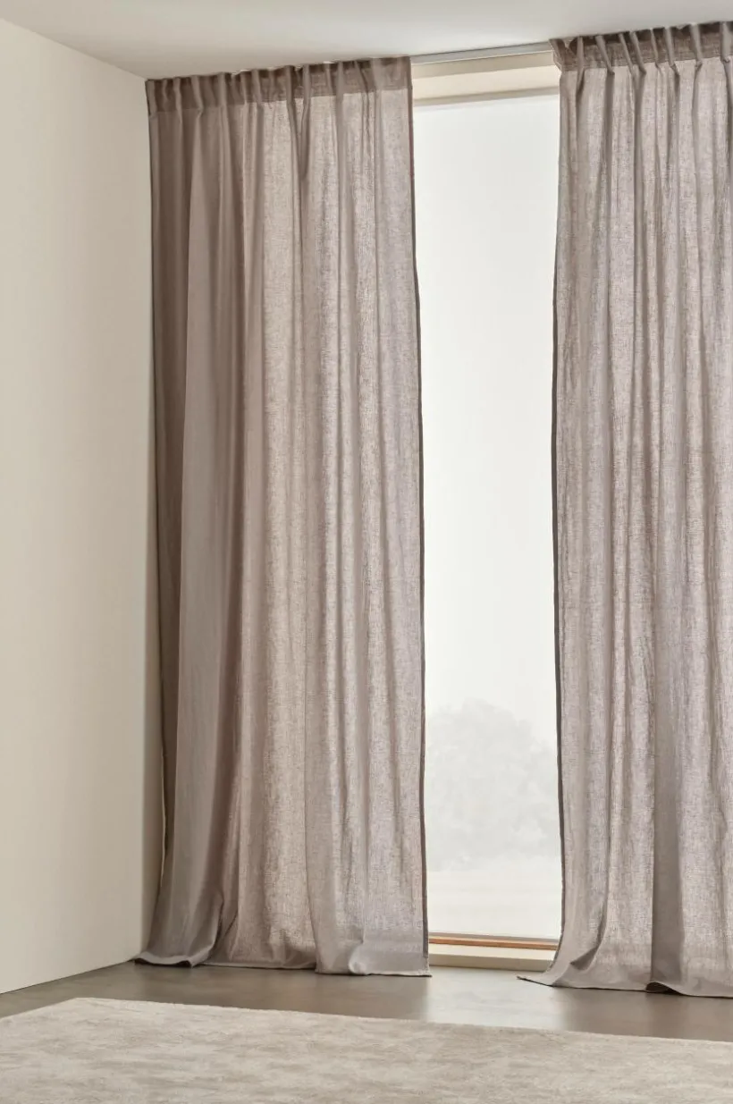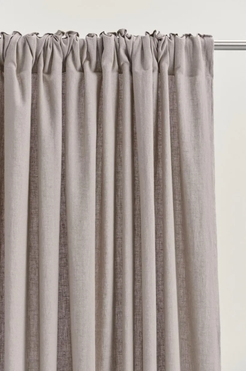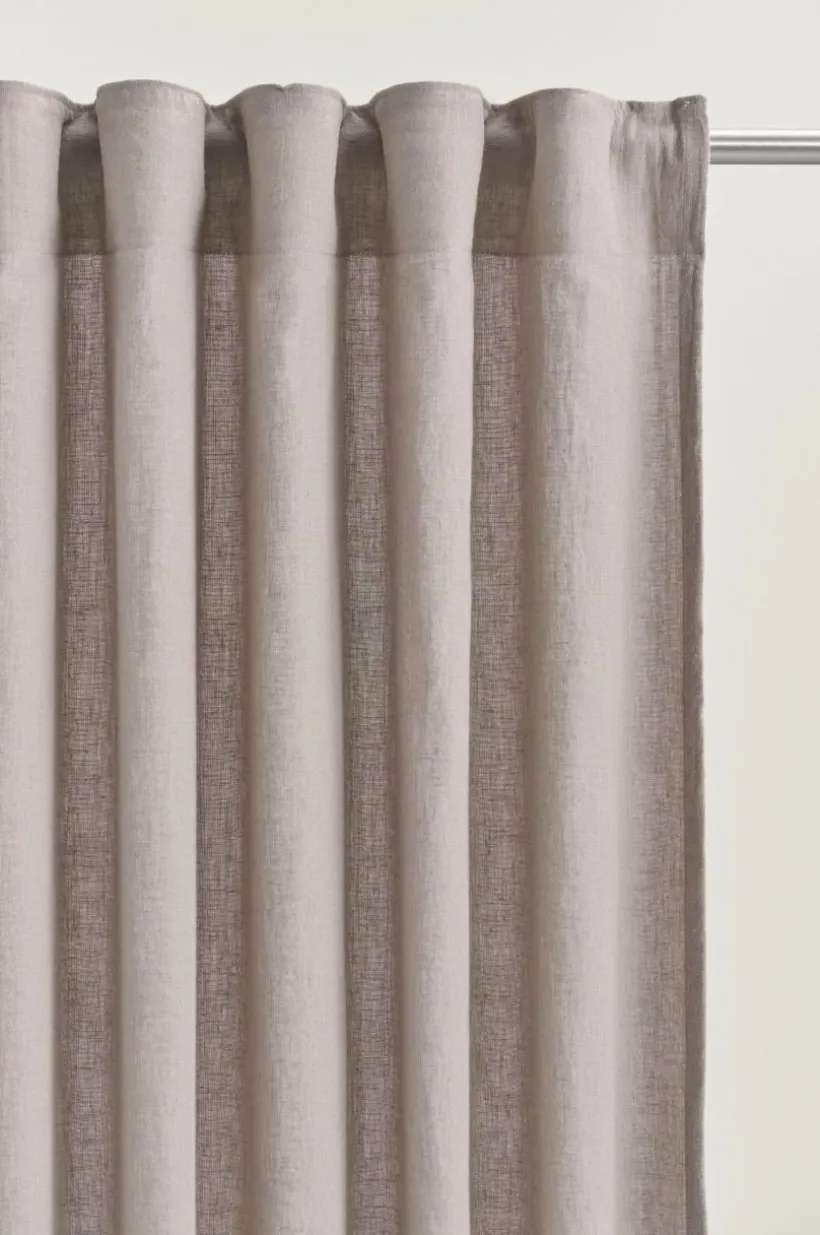 Två gardinlängder i fin mix av ekologisk bomull och lin som är European Flax-certifierad. Det behagliga tyget är semitransaprent och glesvävt för att få den rätta känslan. Gardinlängderna är plaggtävättade vilket innebör att de tvättats efter sömnad. De har påsytt multifunktionsband och kan hängas upp med fingerkrokar, kanal samt dold hälla.
