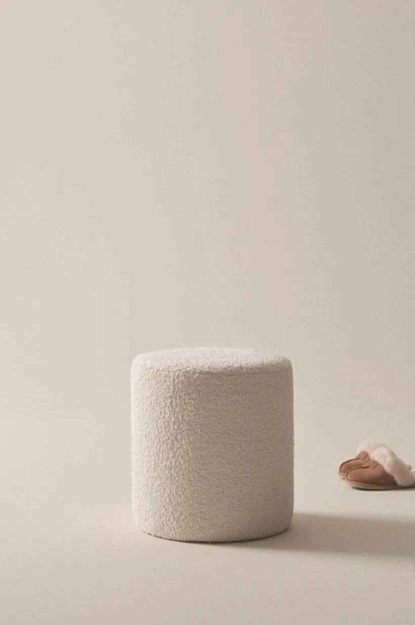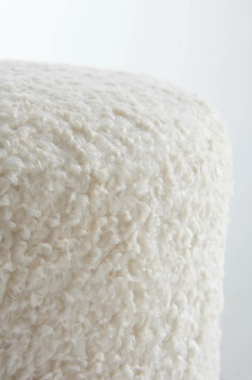 Rund sittpuff med fast fårskinnslik teddyklädsel av polyester. Puffen har träram av furu och plywood i stommen kombinerat med kallskum som gör den mjuk. Den härliga sittpuffen kan du använda som fotpall likväl som du kan sitta på den. Det tåliga teddytyget har slitstyrka på 100000 Martindale.