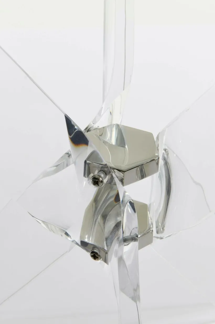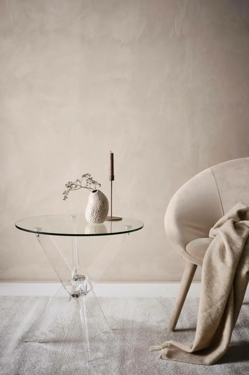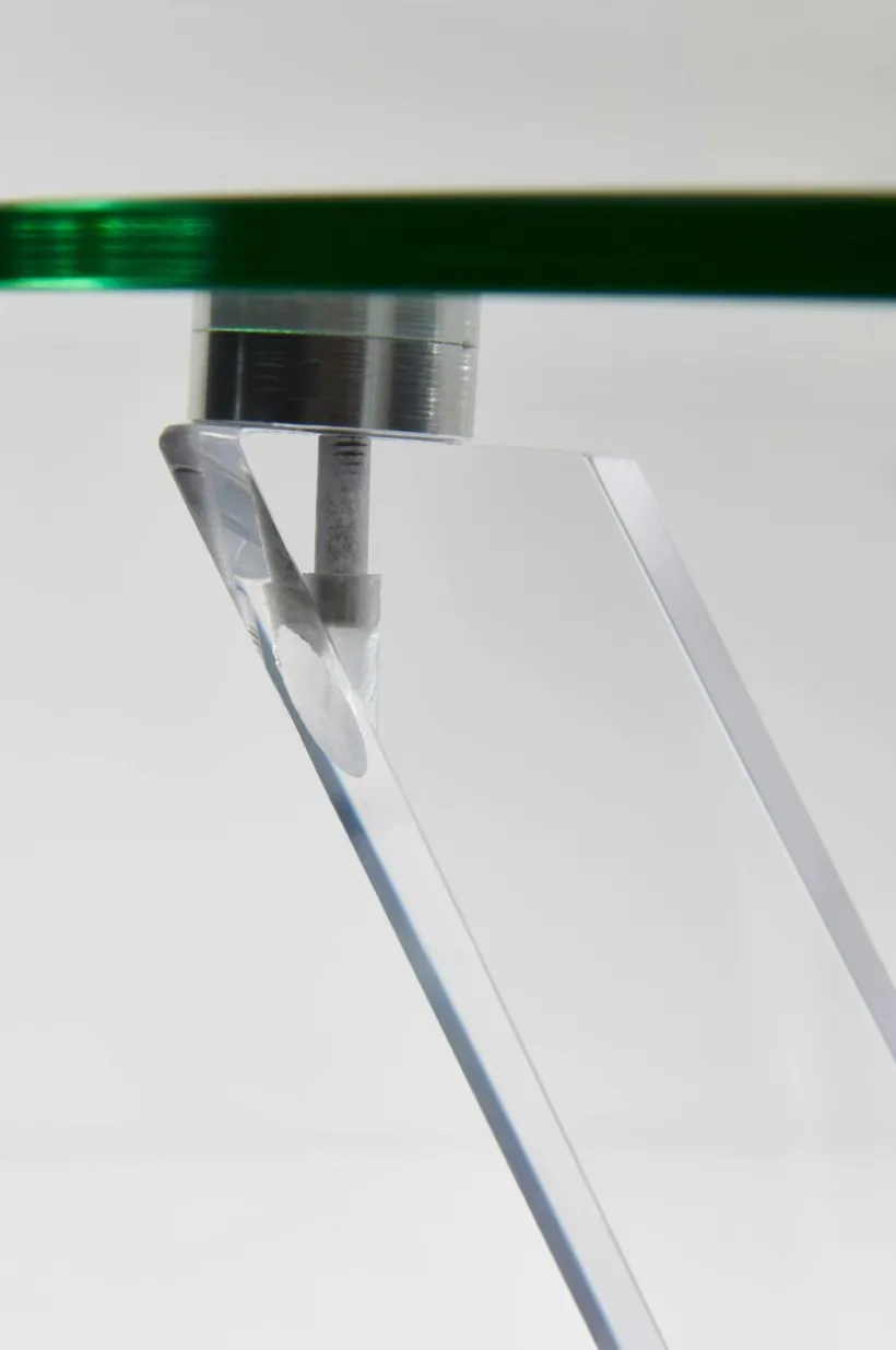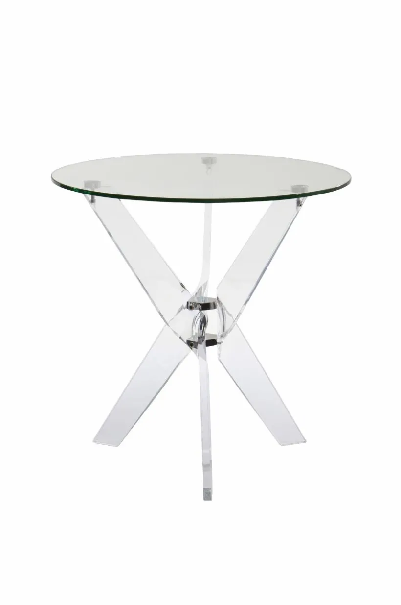 Runt, transparent sidobord med underrede i akrylglas och bordsskiva av härdat glas. Bordet är modernt i stilen med trebent underrede, det känns elegant och svävande lätt. Viss montering krävs. Monteringsanvisning medföljer.