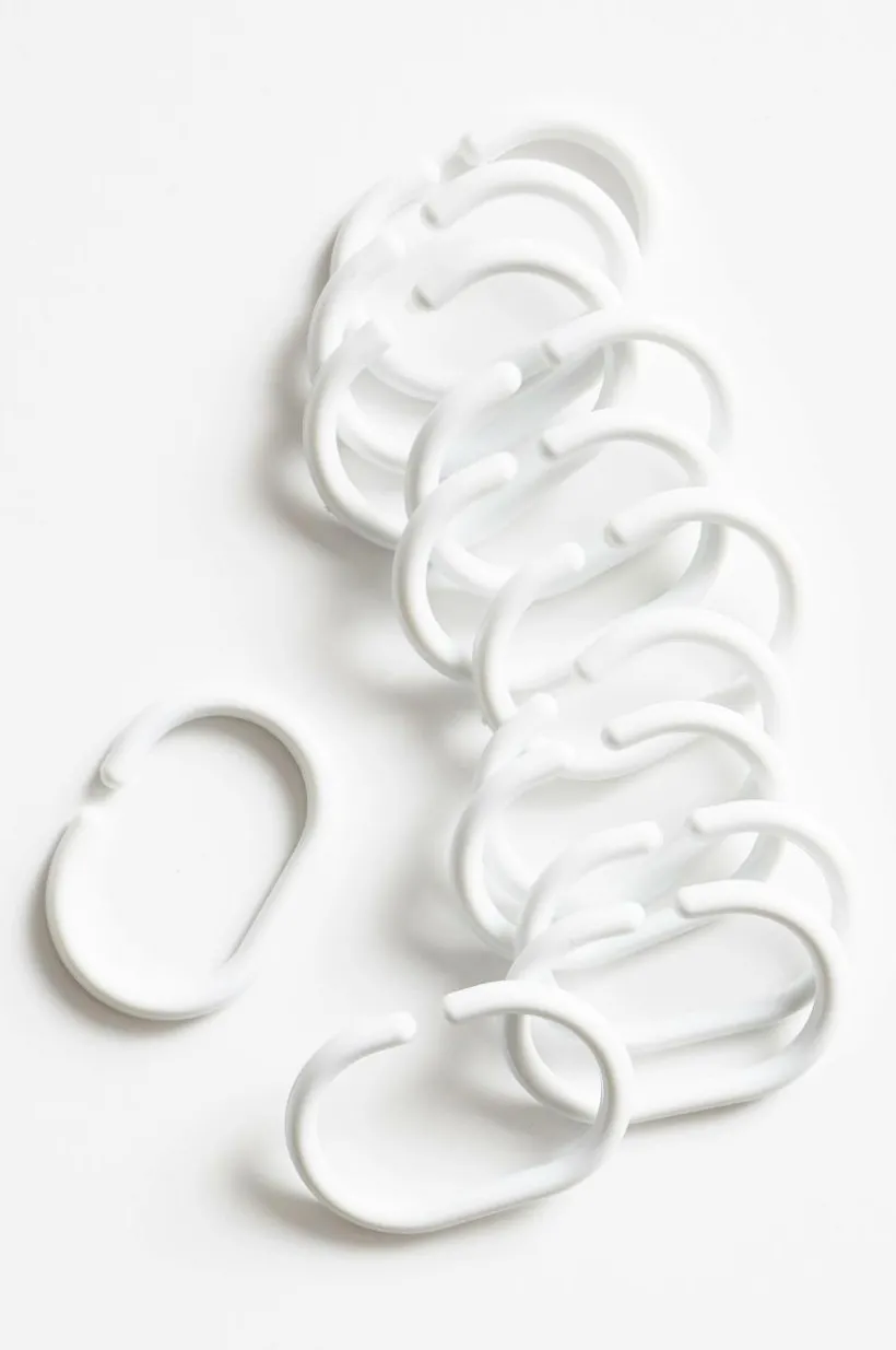 12-pack duschdraperiringar av plast. C-formen gör det enkelt att hänga upp duschdraperiet på stången.