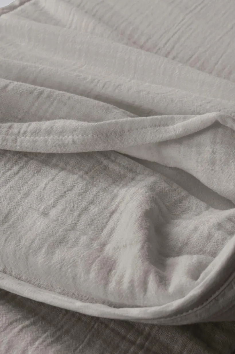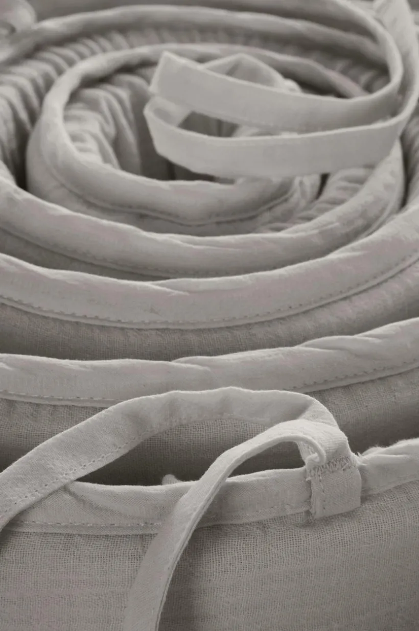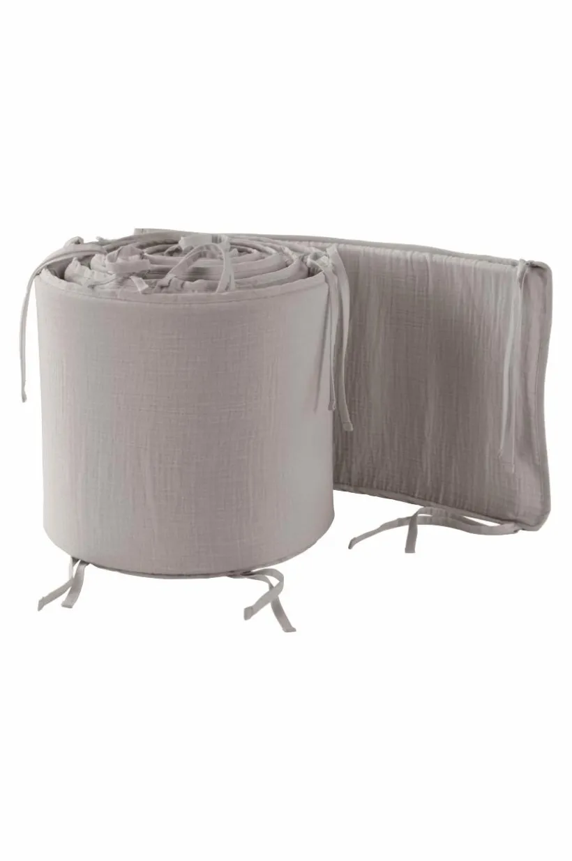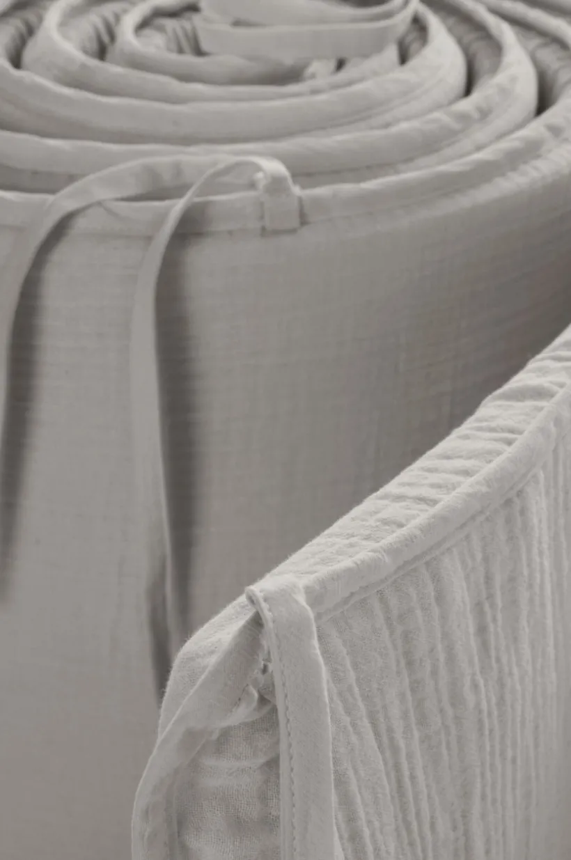Enfärgat spjälsängsskydd med yttertyg av härlig, ekologisk bomullsmuslin. Muslin är ett mjukt tyg, vävt med bubblig effekt, vilket gör tyget mjukt och extra lättskött. Du behöver inte stryka eller mangla. Det behagliga muslintyget är mjukt och skönt mot det lilla barnets hud. Fyllning av polyester med mjuk skumgummikärna. Spjälskyddet gör spjälsängen mer ombonad och mysig, samtidigt som det hindrar barnet från att slå emot spjälorna i sömnen. Spjälsängsskyddet knyts fast med knytband. Yttertyget är avtagbart med dragkedja i öppningen och tvättbart.