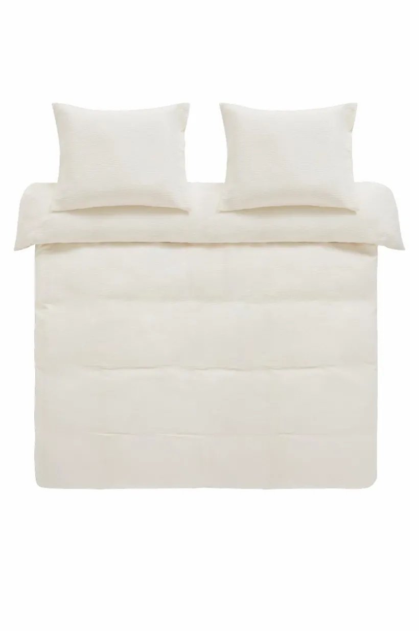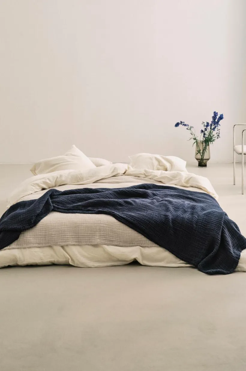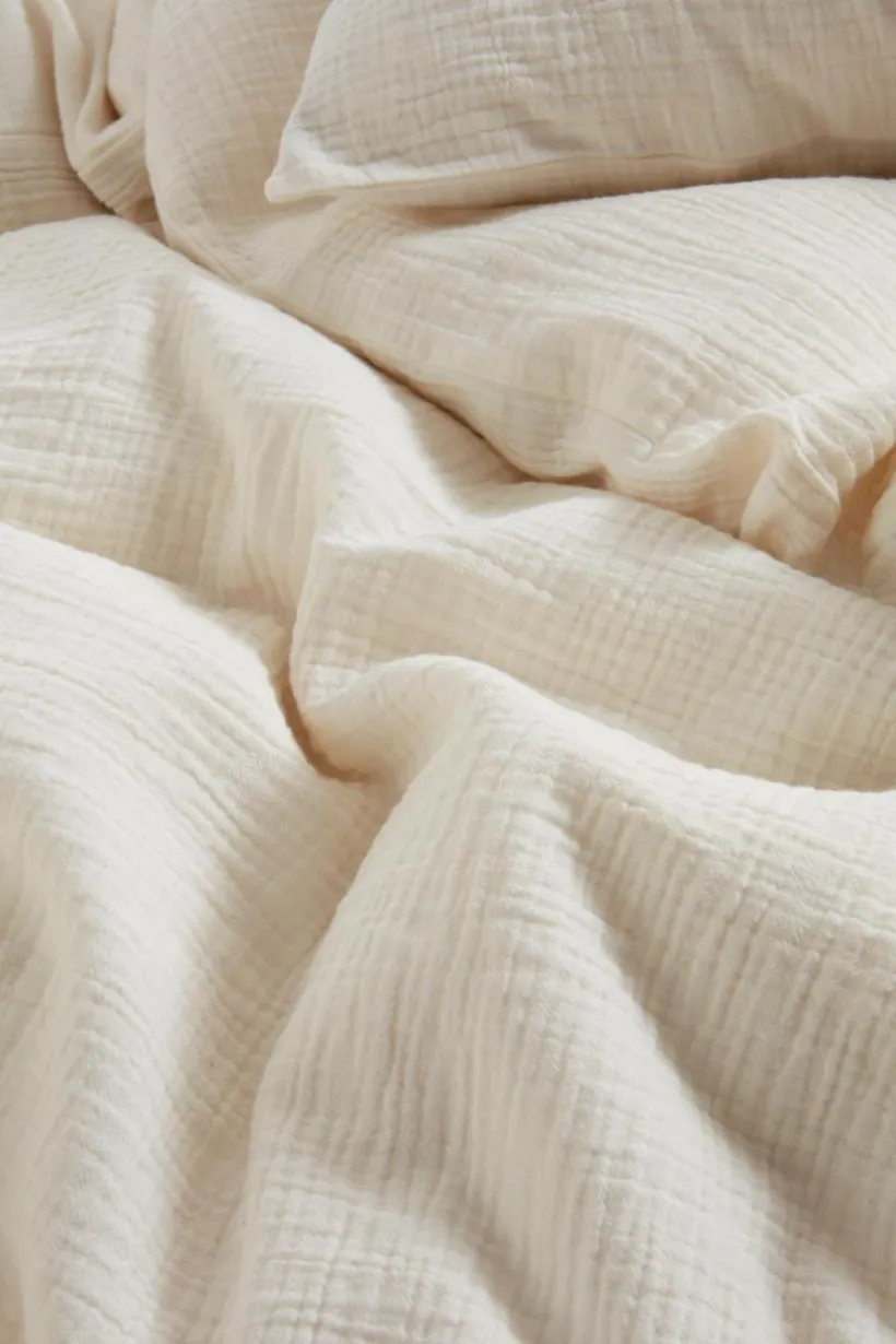Påslakanset i 3 delar i härlig, ekologisk bomullsmuslin. Muslin är ett mjukt tyg, vävt med bubblig effekt, vilket gör tyget mjukt och extra lättskött. Du behöver inte stryka eller mangla. Det behagliga muslintyget är skönt att sova i. Öppning i övre hörnen på påslakanet, som underlättar att trä påslakanet över täcket. Trådtäthet på 178 tc. (Trådtätheten talar om antalet trådar, thread counts, per kvadrattum i ett tyg. Ju högre trådtäthet desto högre kvalité.)