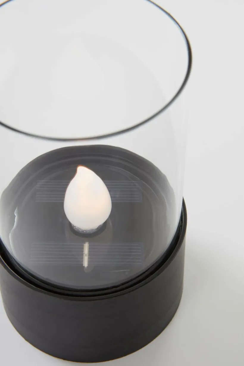 Öppen bordslykta med glaskupa och plastfot. LED-lampan som ser ut som en brinnande låga ger ett mjukt sken. Lyktan drivs av solenergi. Sommarkvällarna får en fin inramning med LILLIAN på balkongbordet. Lyktan är för utomhusbruk.