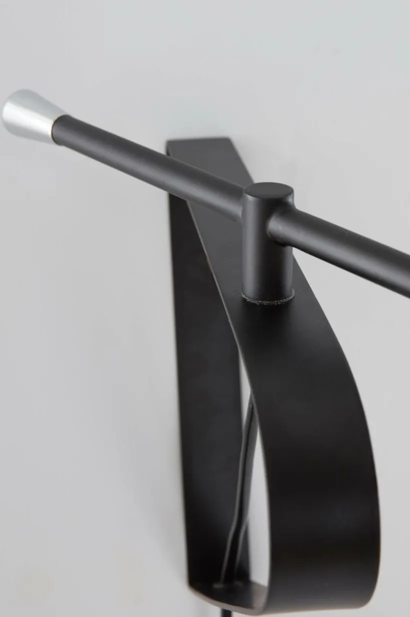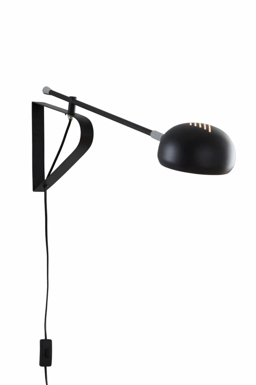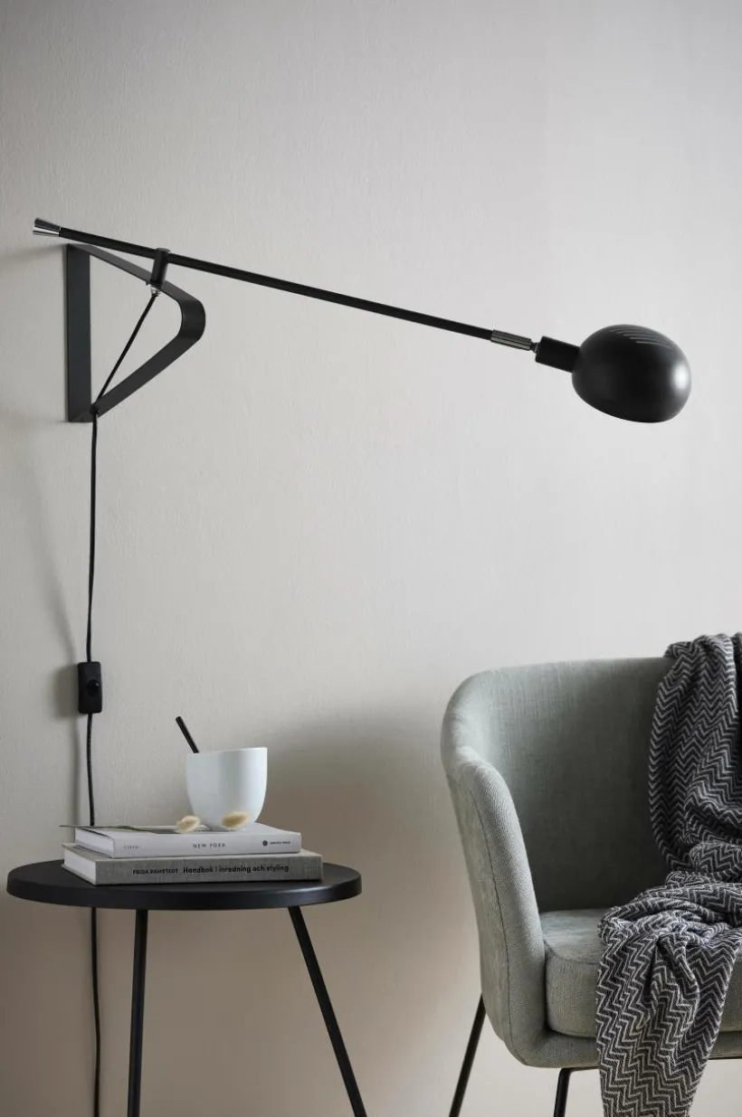 Vägglampa i metall med kromfärgade detaljer. Flexibel modell med vridbar arm och ställbar skärm så du kan få ljuset där du önskar. En bra funktion över soffan när du vill ha en riktbar läslampa eller över arbetsplatsen. Svart sladd, längd 1,5 m.
