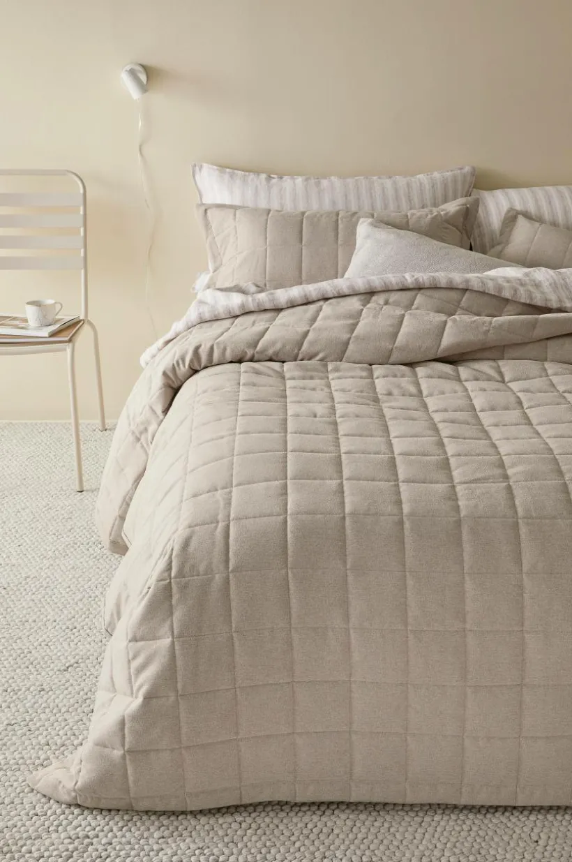Enfärgat överkast för dubbelsäng i mjuk polyester med fin struktur som ger en härlig linnekänsla. LINDEN överkast är quiltat i dekorativa fyrkanter. Fyllning av polyester 80 g/m².