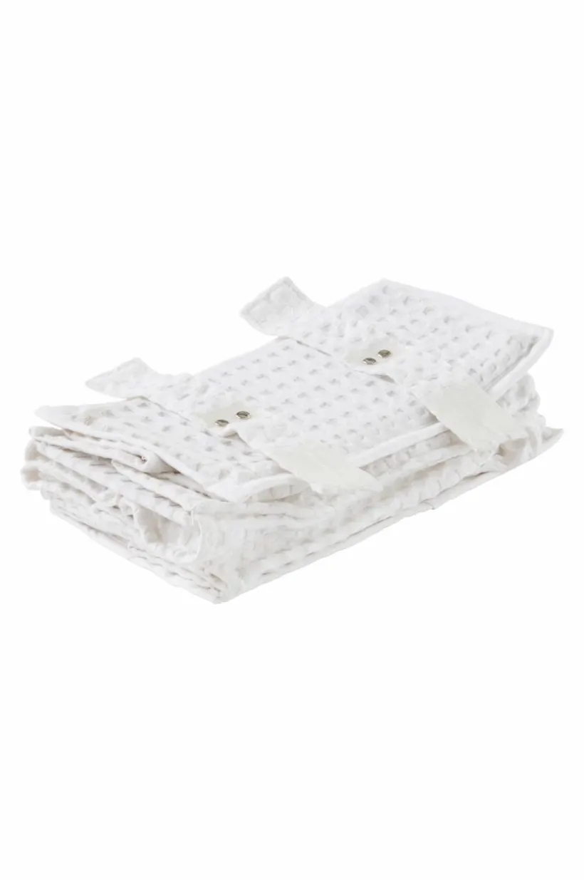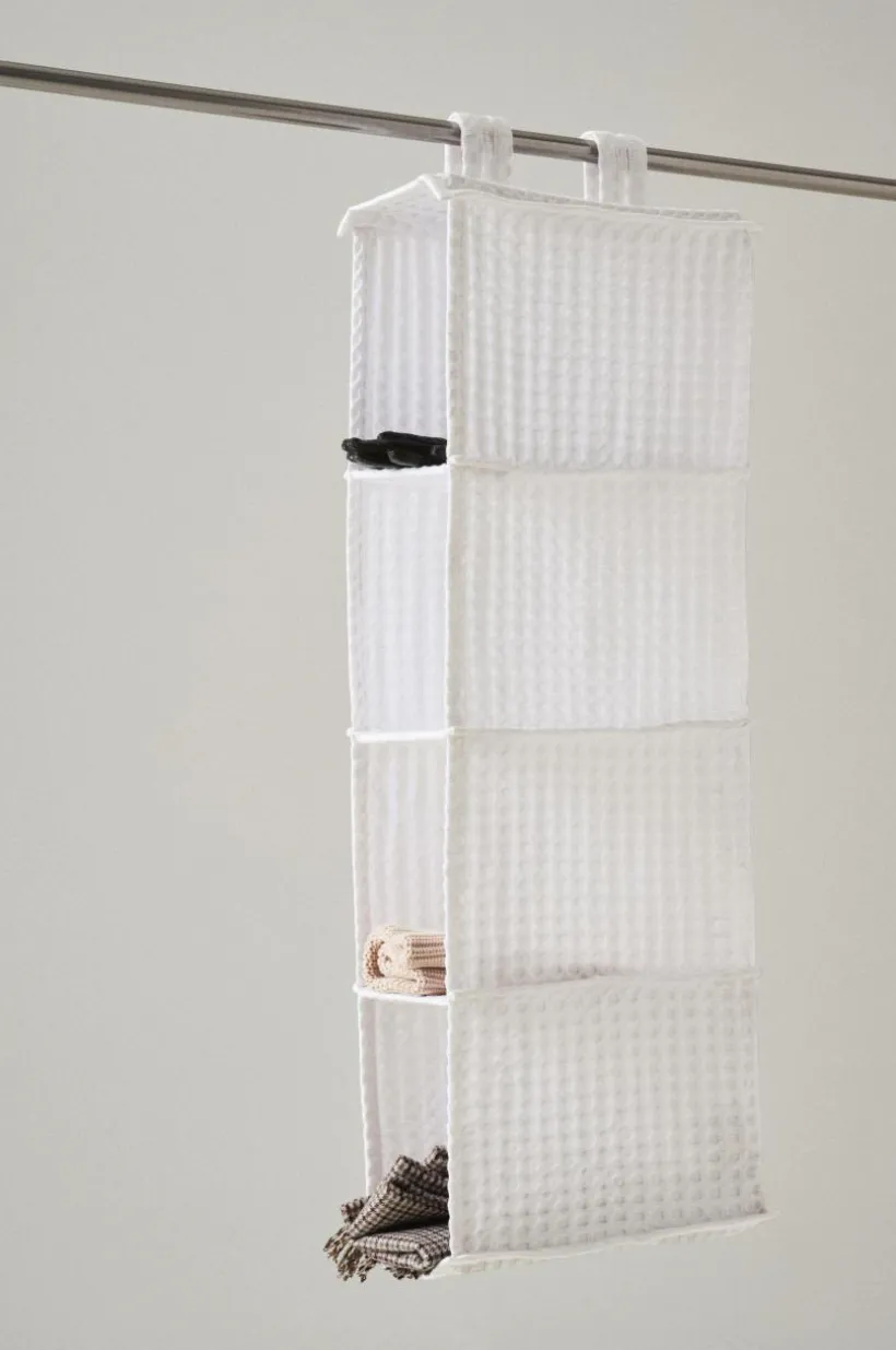 Garderobsförvaring av bomull med fyra fack för till exempel skor. Tyget har vävd våffelstruktur. Upptill har förvaringen två hällor med kardborrelås, så du enkelt kan hänga upp den runt en klädstång, en galge eller en rundstav. De fyra facken är förstärkta med kartong för att göra dem extra stabila. Garderobsförvaringen är också perfekt i hallen, i barnkammaren och överallt där du behöver lite extra förvaring.
