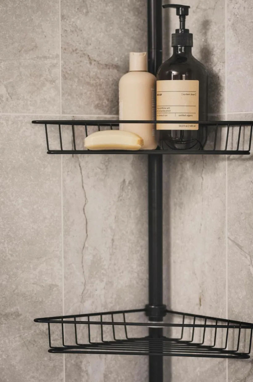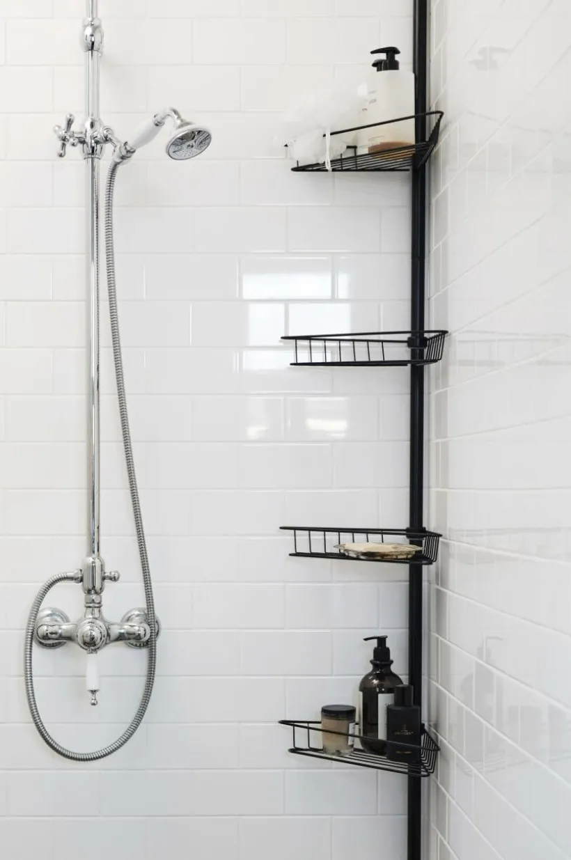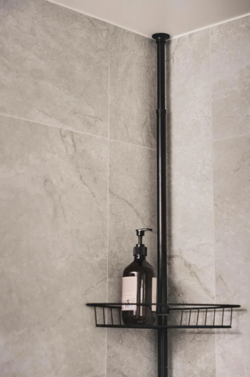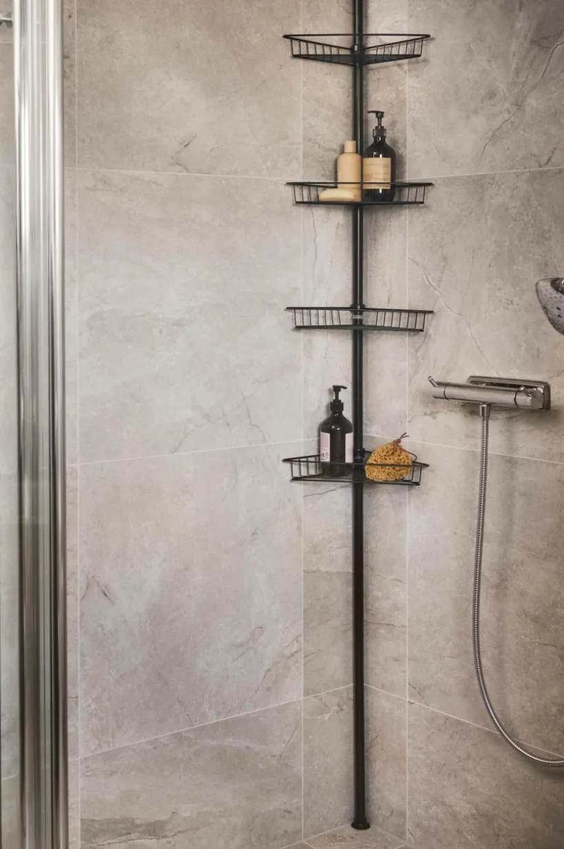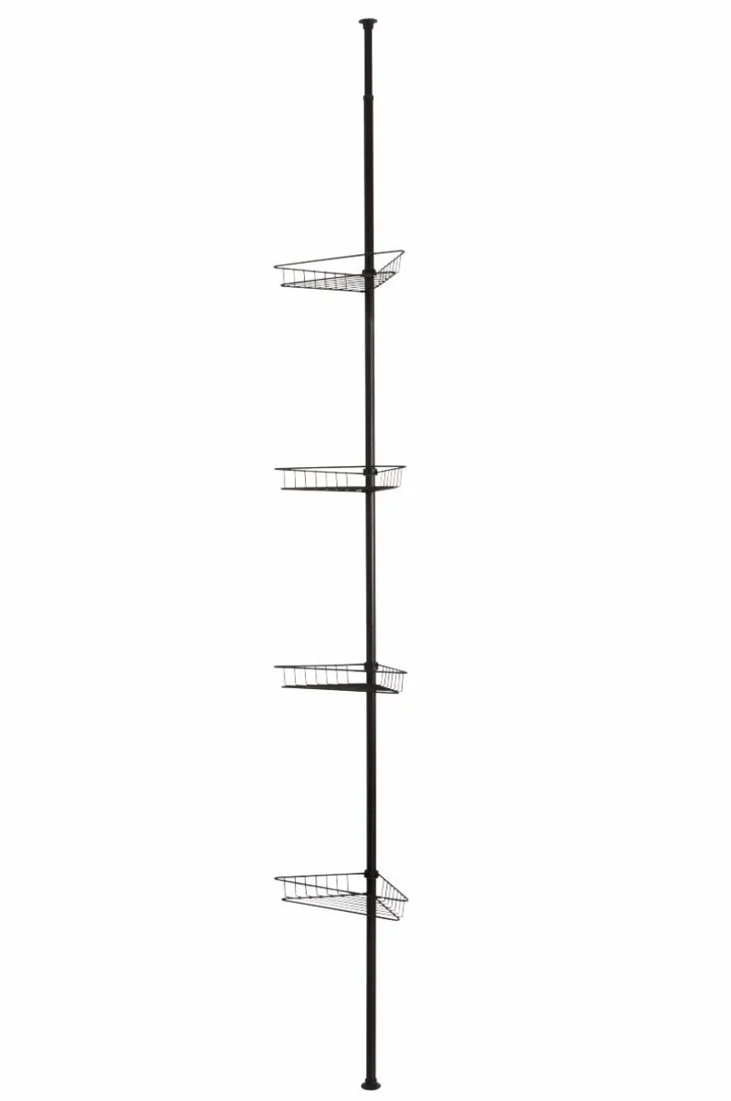 Praktisk hörnhylla till badrummet. Placera hyllan mellan badkarskanten och taket, eller från golv till tak. Teleskopstång ger reglerbar höjd och gör den enkel att fästa. Flexibel efter dina önskemål med fyra flyttbara hyllor. Det är viktigt att du följer medföljande monteringsanvisning när du monterar hyllan för stabiliteten.