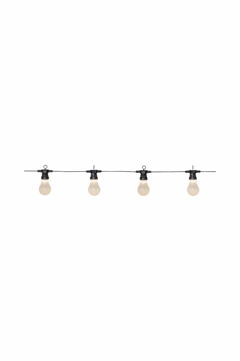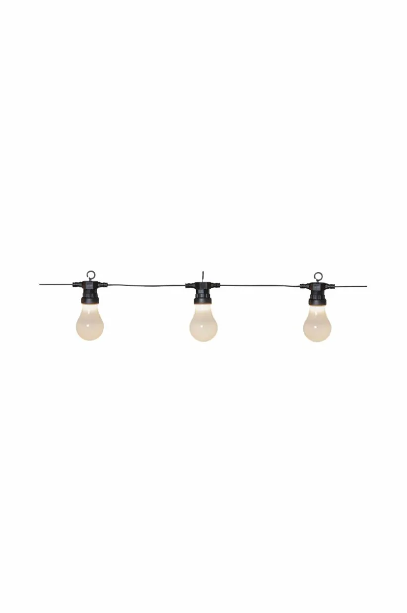 Partyljusslinga med 10 st opalfärgade höljen med SMD LED inuti. Härlig ljusslinga att inreda med till vardags och fest. Ger ett vackert varmvit sken i mörkret. Transformator: 15V DC 3W, IP44, Schuko-kontakt. Anslutningskabelns längd är 500 cm. Avstånd mellan lamporna, 45 cm.