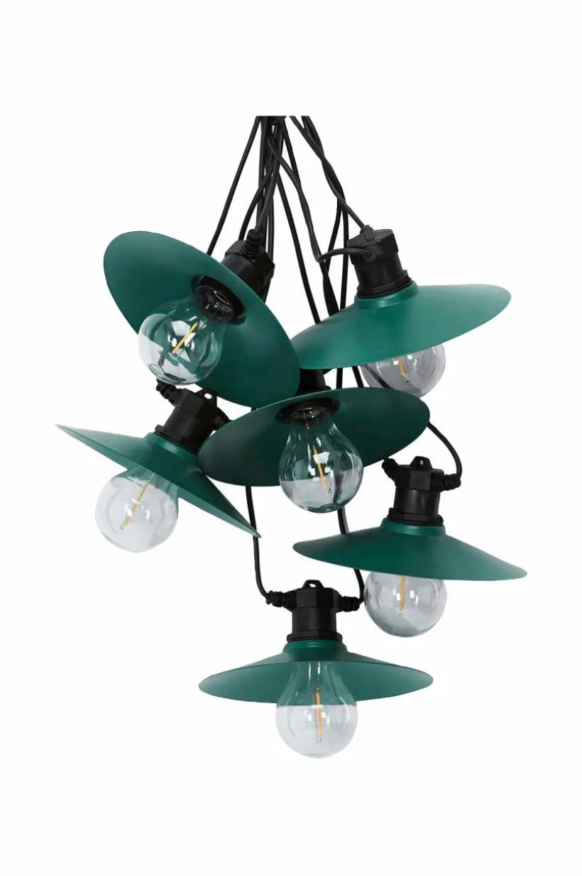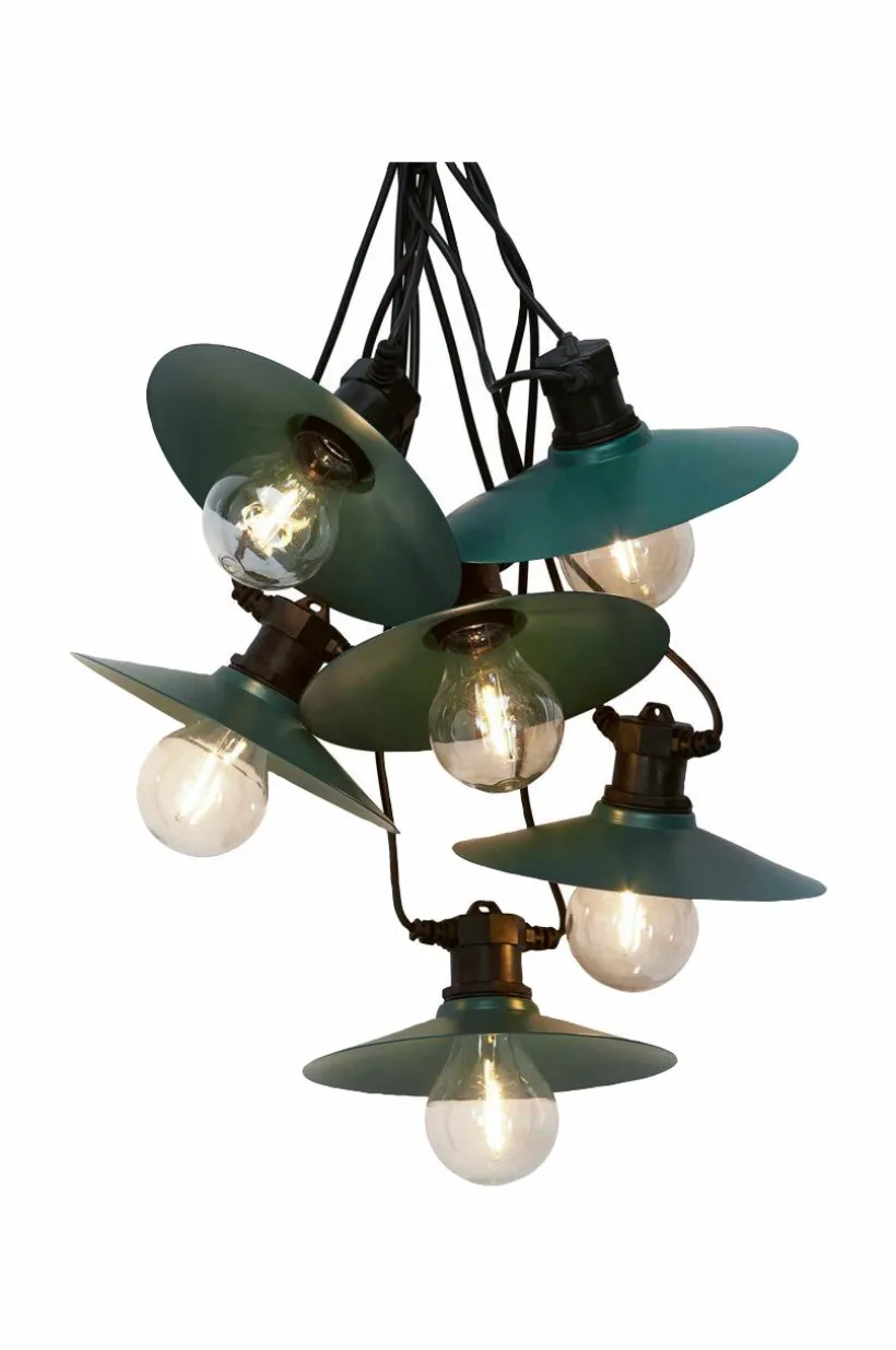Donna Ljusslinga med släta skärmar i metall. Ljusslingan har 6st skärmar med fasta LED lampor. Anpassad för utomhusbruk med klassificering IP44, men kan även hänga inomhus. Total längd 7,9 meter. 3 meter till 1:a lampan och sedan 0,7 meter mellan varje lampa. Ljuskällorna är inte utbytbara.