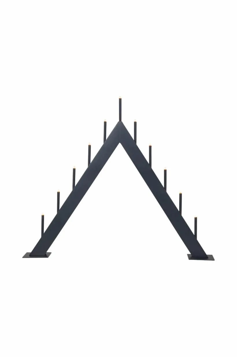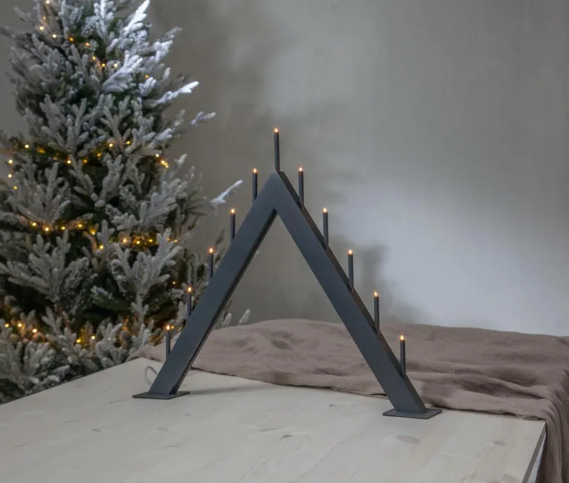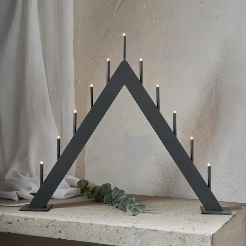 Stilren adventsljusstake, tillverkad i trä med ljuspipor av tunna metallrör. 9 st ljuskällor, E5 lampor. Textilkabel i vitt/grå. Ger ett härligt stämmnigsfullt ljus hela året runt. Effekt 0,6W.