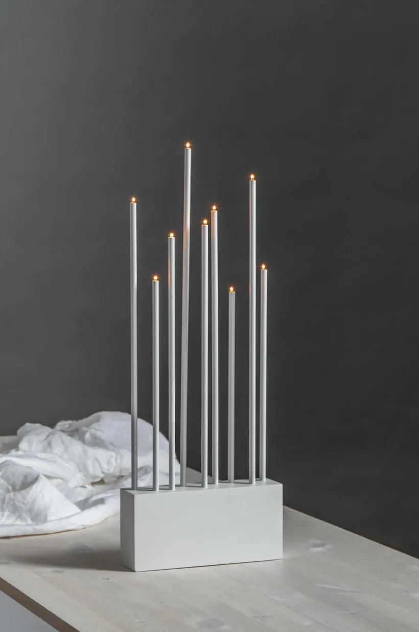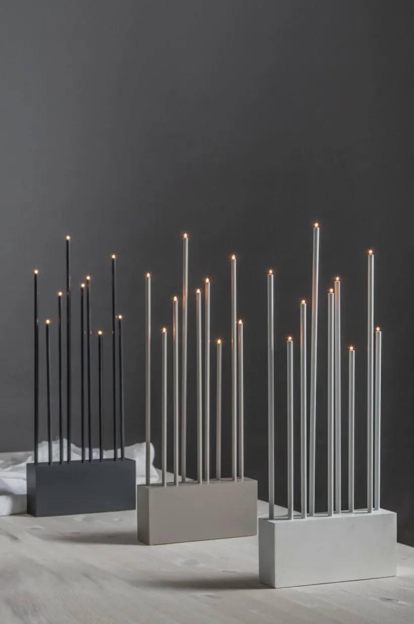 Stilren ljusstake med kraftig träbas, ljuspipor av tunna metallrör. 9 st ljuskällor, E5 lampor, ingår. Hela ljusstaken i grafit. Färgad textilkabel med strömbrytare. Ger ett härligt stämnigsfullt ljus hela året runt. Lampans spänning 12V. Volt 12V.
