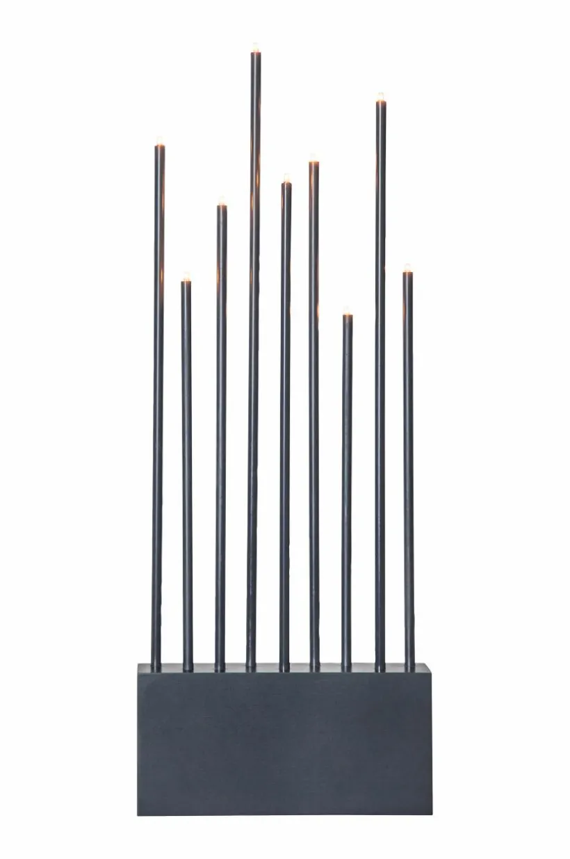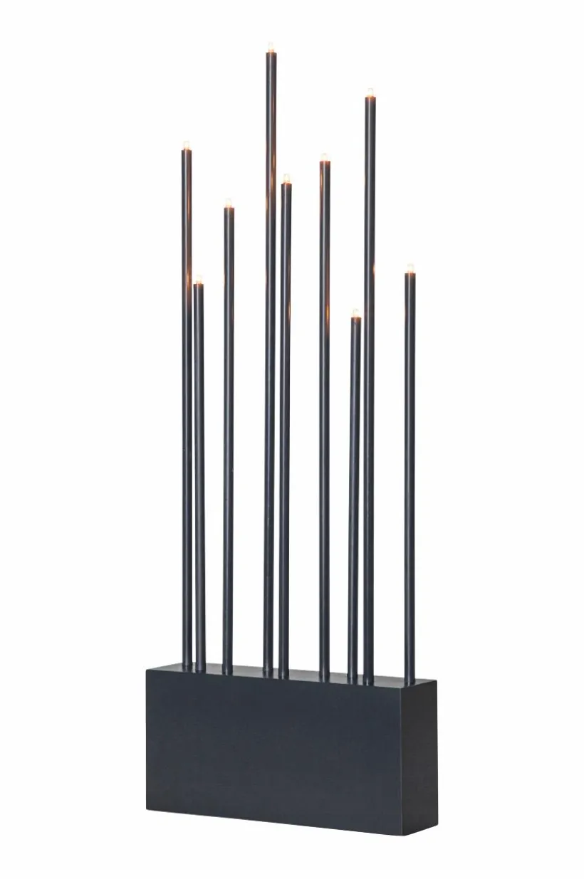 Stilren ljusstake med kraftig träbas, ljuspipor av tunna metallrör. 9 st ljuskällor, E5 lampor, ingår. Hela ljusstaken i grafit. Färgad textilkabel med strömbrytare. Ger ett härligt stämnigsfullt ljus hela året runt. Lampans spänning 12V. Volt 12V.