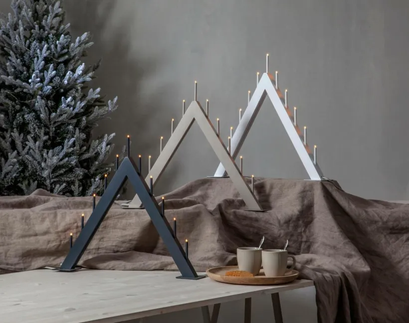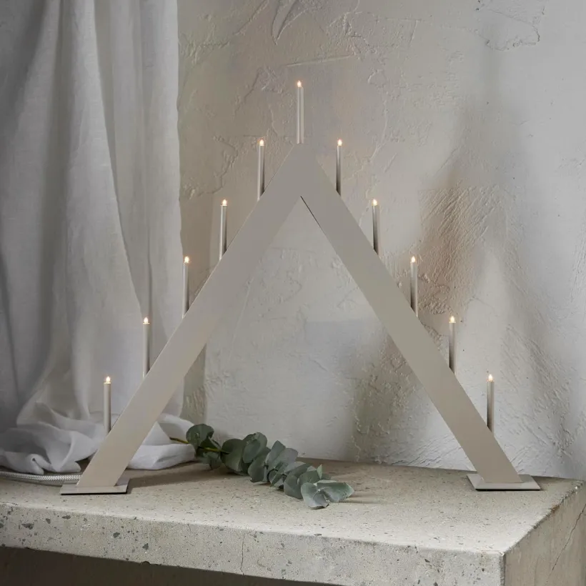 Stilren adventsljusstake, tillverkad i trä med ljuspipor av tunna metallrör. 11 st ljuskällor, E5 lampor. Textilkabel i vitt/grå. Ger ett härligt stämningsfullt ljus hela året runt. Effekt 0,6W.