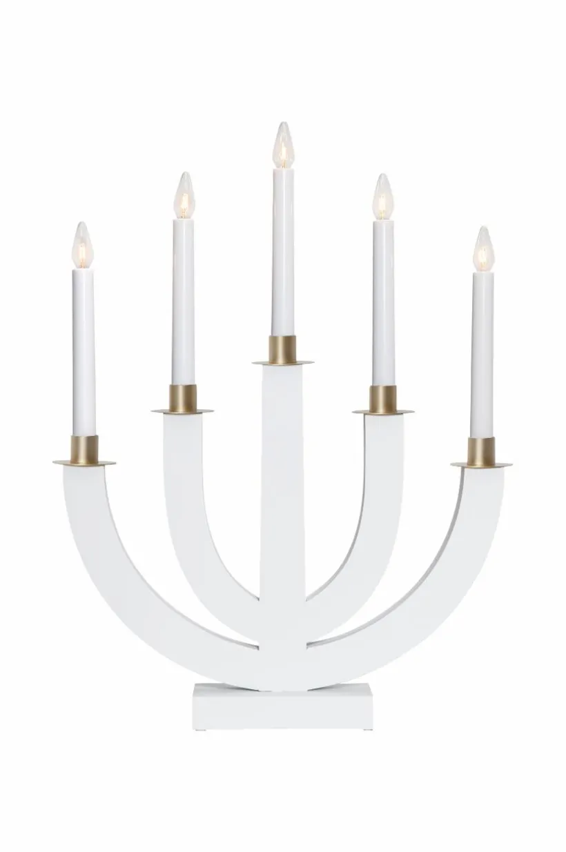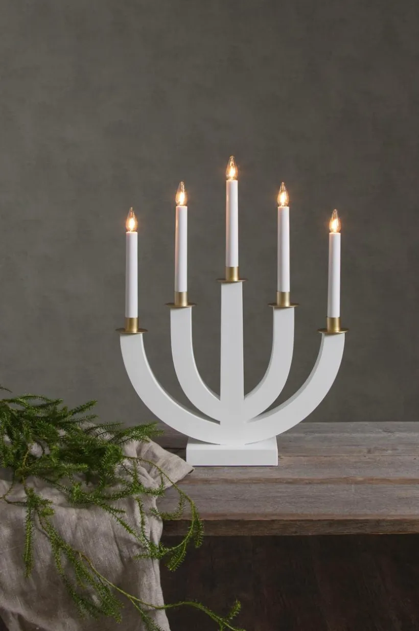 Träljusstake med 5 ljuskällor och guldmålad dekoration, lätt att placera och skapar en härlig julstämmning både i fönster och inne i rummet på tex en hylla eller skänk. E10-sockel, ljuskälla ingår. Vit anslutningskabel, 180 cm. Höjd 47 cm, bredd/längd 37 cm och djup 8 cm.