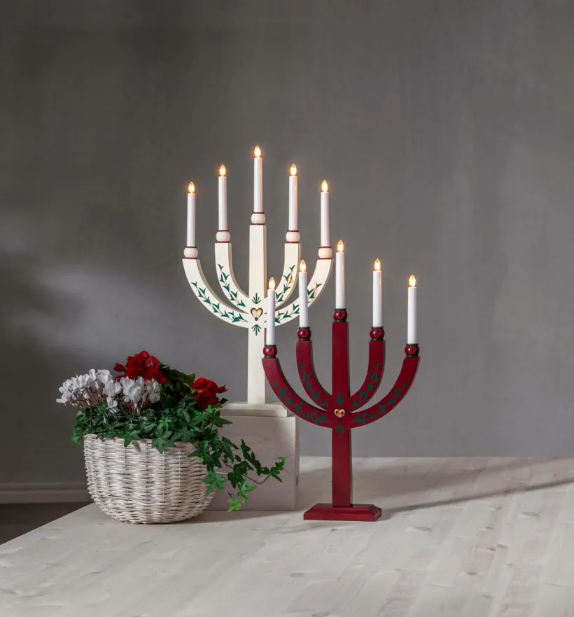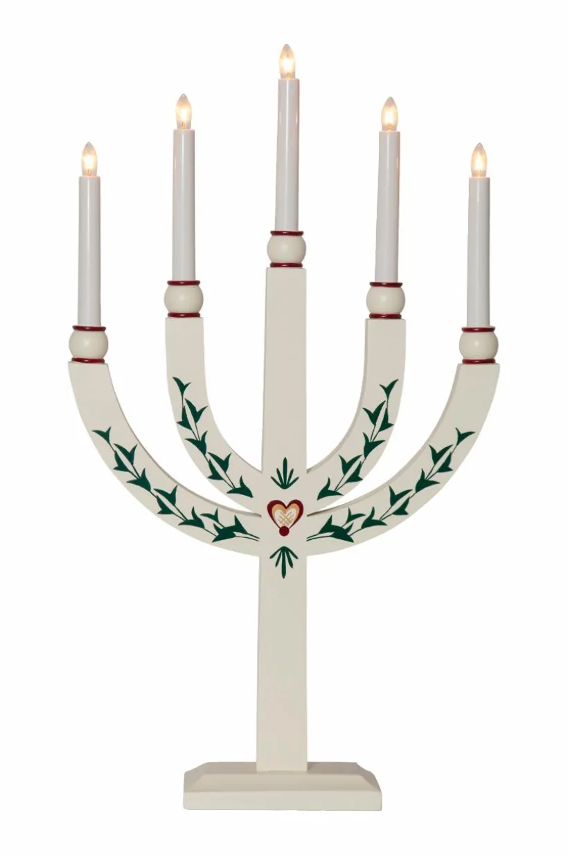 Traditionell träljusstake med fina detaljer. Adventsljusstaken har 5 ljuskällor som ger ljusstaken en mysig belysning och en hemtrevlig julkänsla. Placera i fönstret eller på en skänk.
