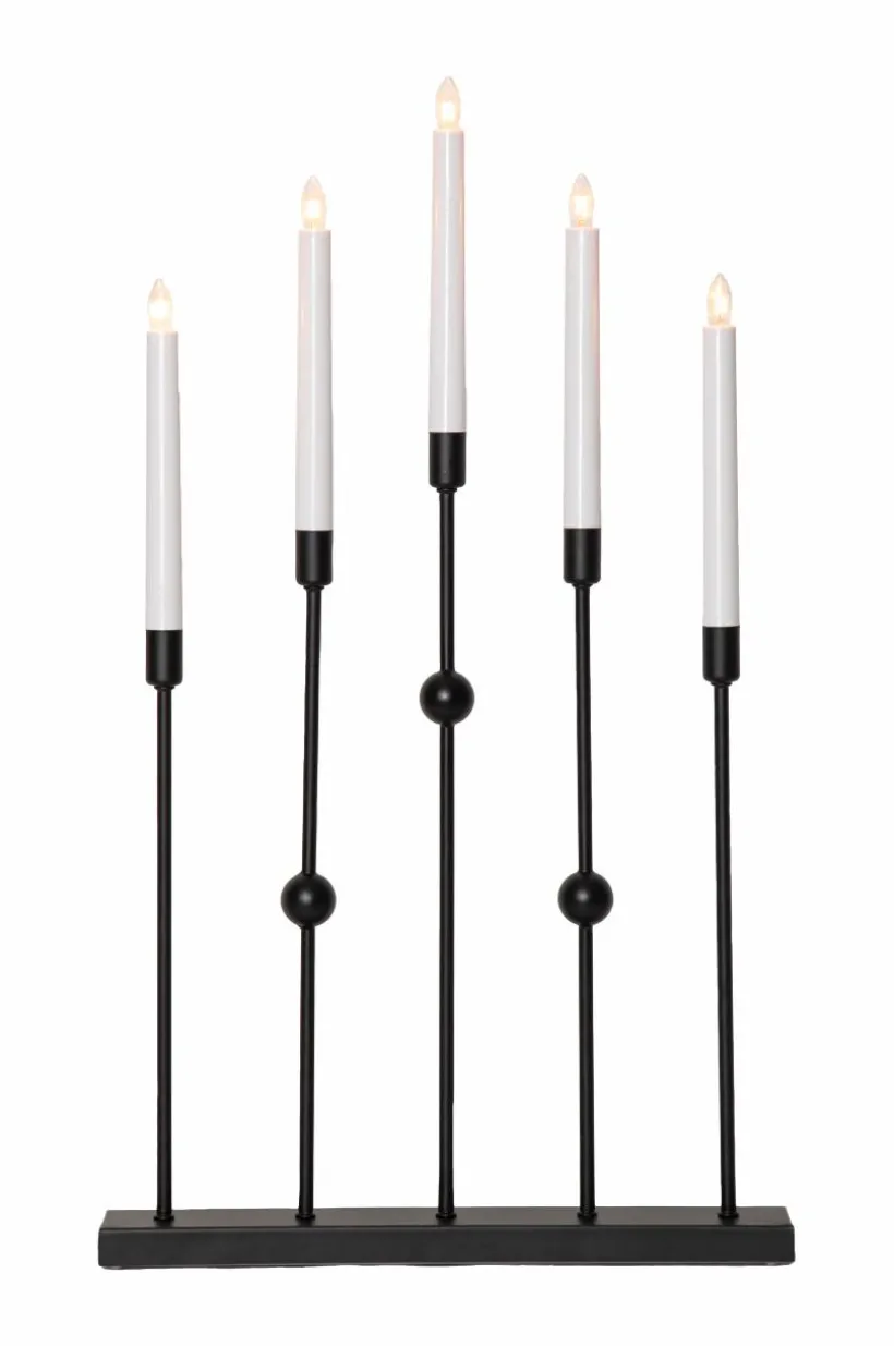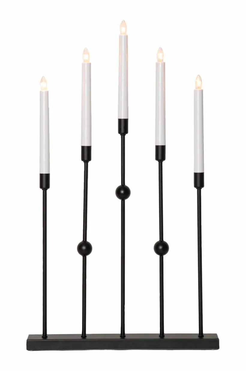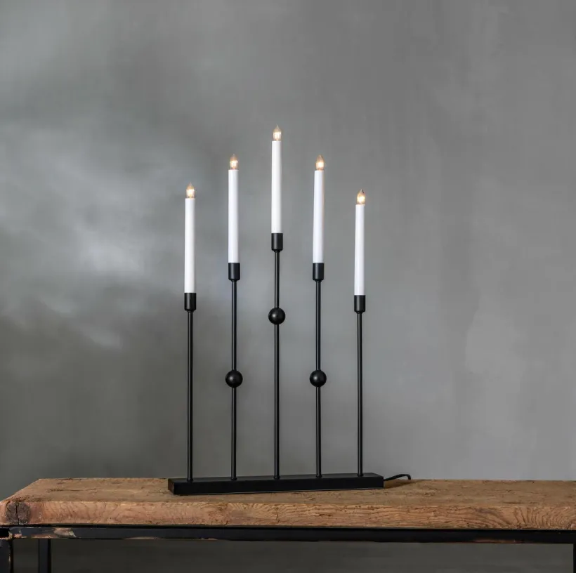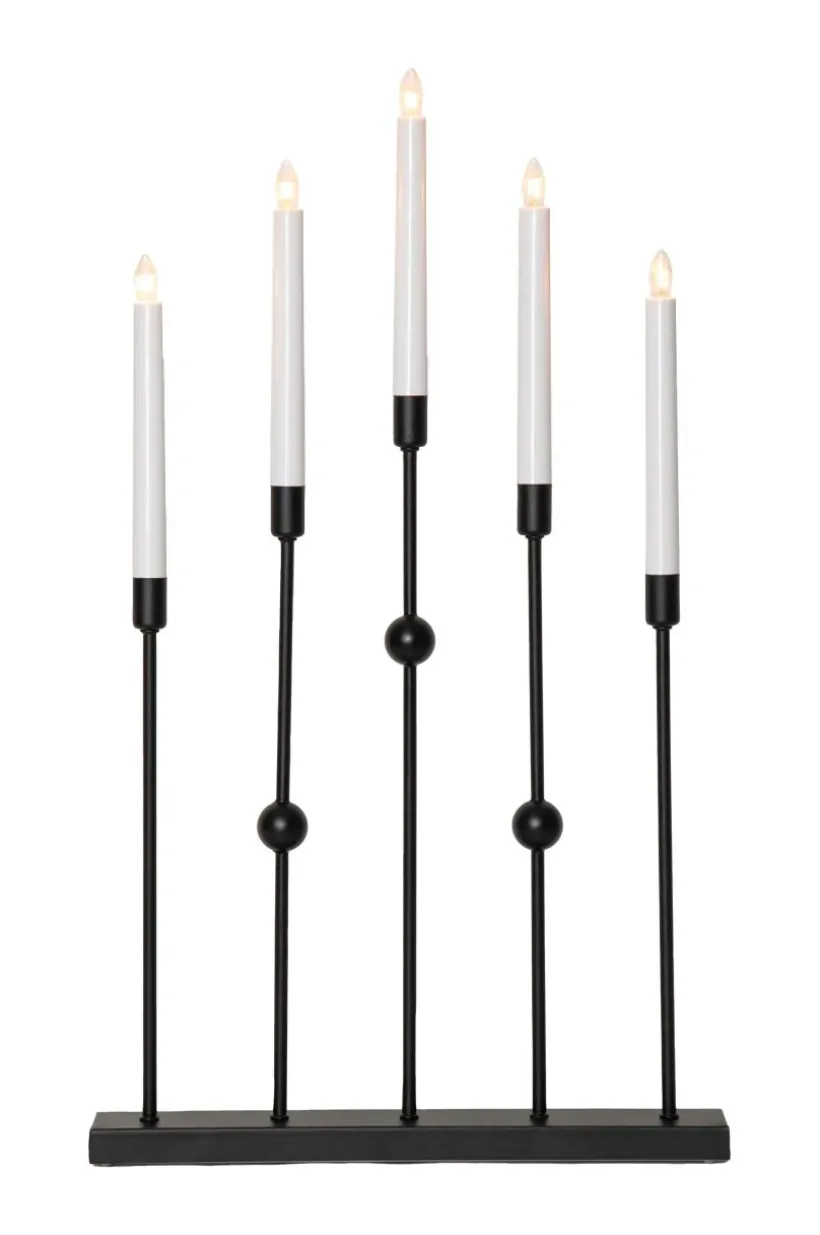 Stilren adventsljusstake i metall. Färgen är mässings. Ljusstaken har 5 ljuskällor med mysigt sken. Placera i ett fönster eller på en skänk, passar utmärkt till advent och jul.