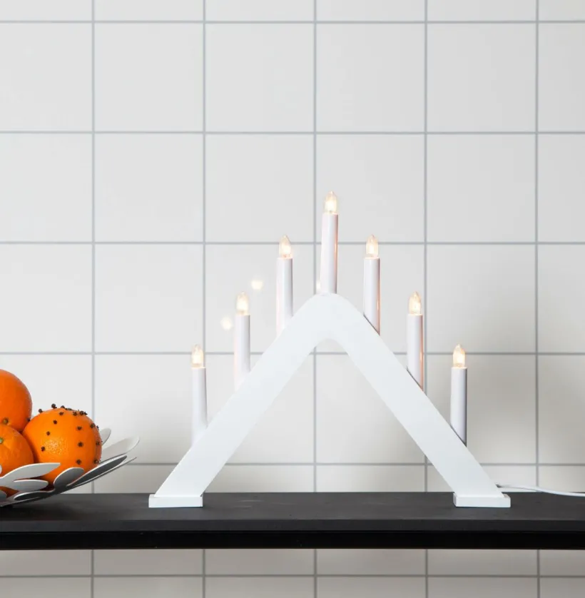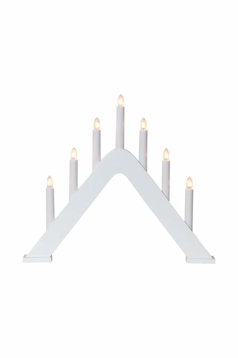Träljusstake, 7-armad i härlig design. Passar fint in i ett fönster för en vacker och hemtrevlig inredning. Skapar en mysig adventstämning i hemmet. E10-sockel, ljuskälla ingår. Vit anslutningskabel, 180 cm. Höjd 36 cm, bredd/längd 41 cm och djup 5 cm.
