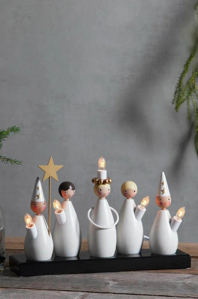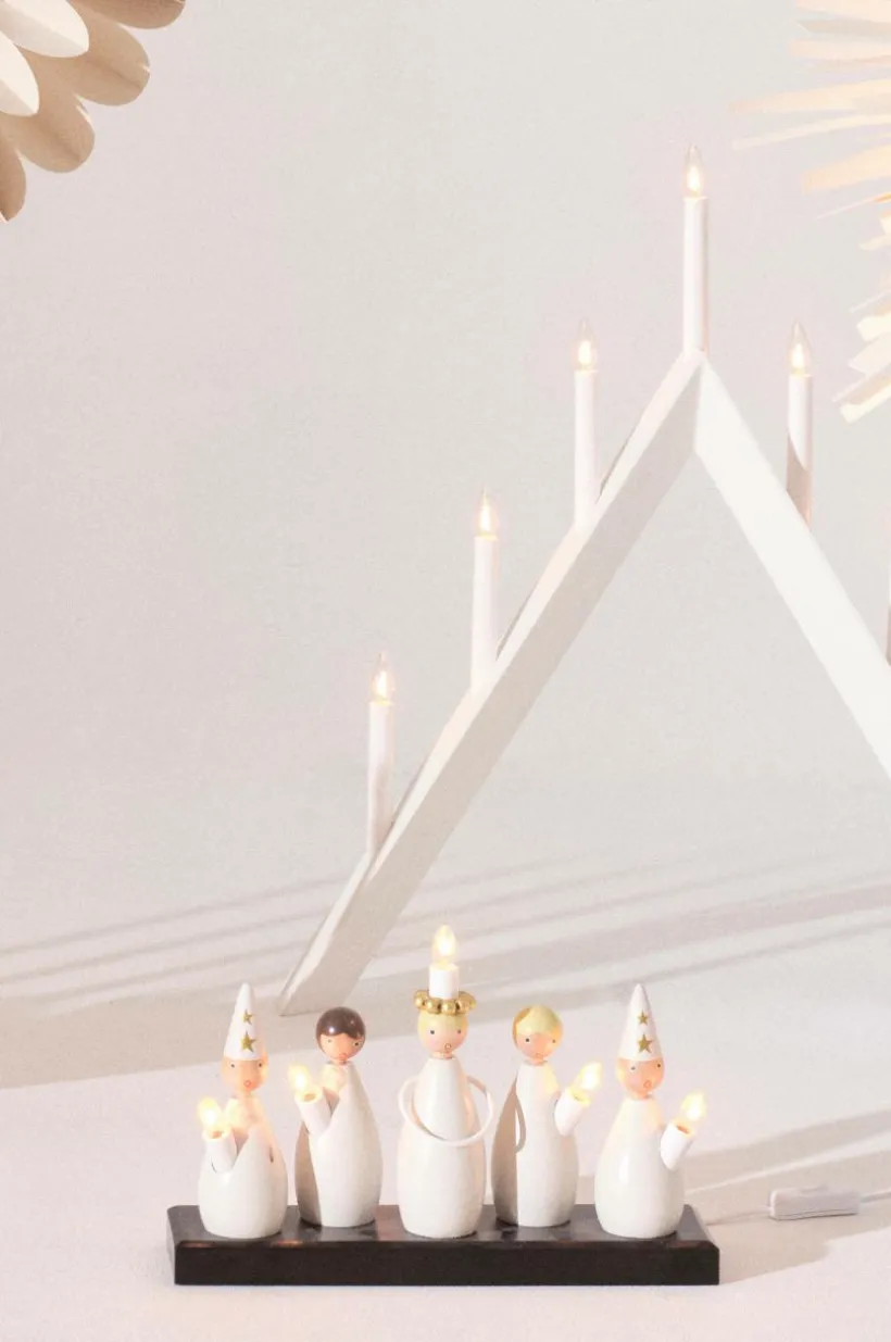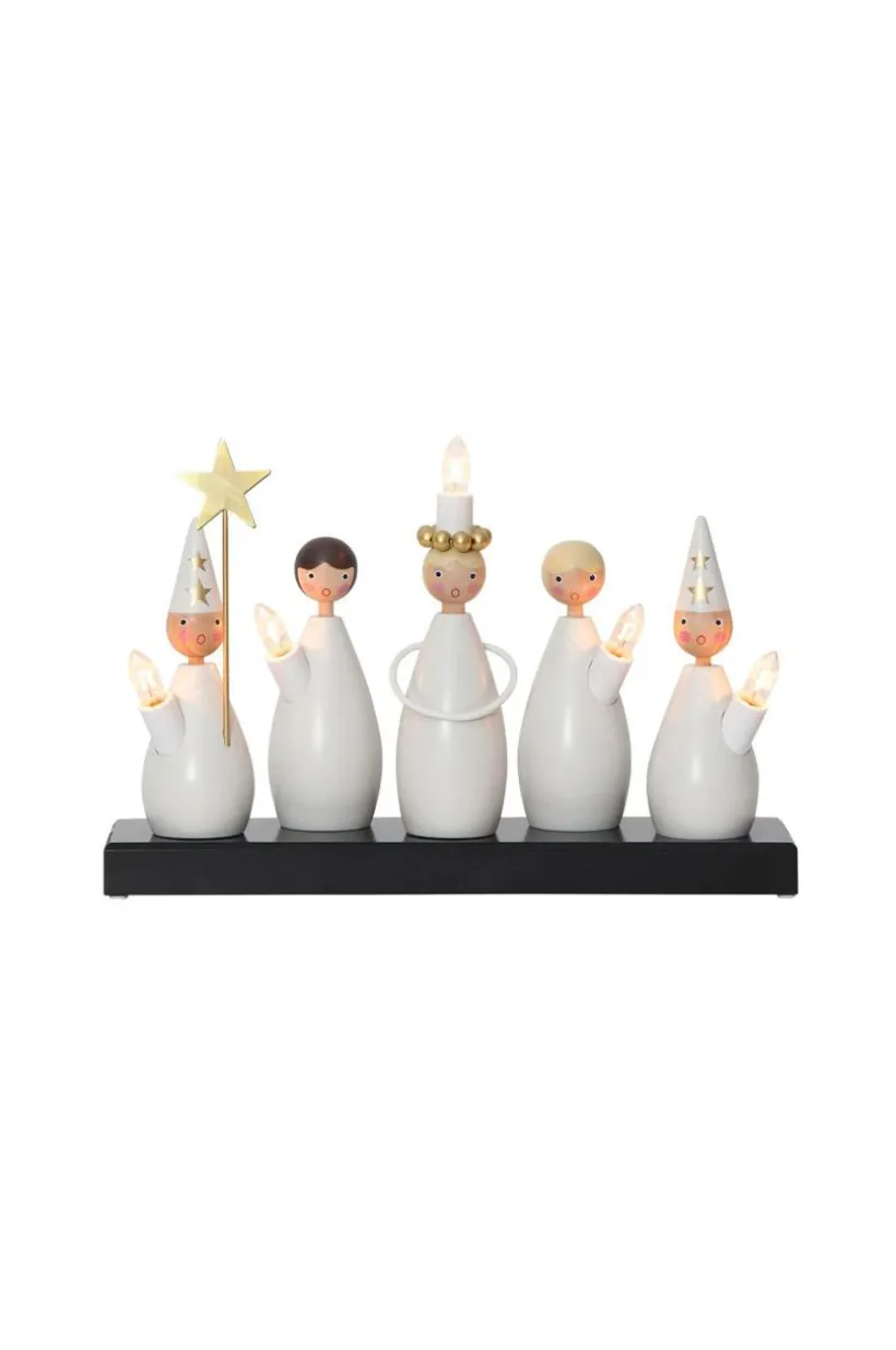 Träljusstake med Lucia, två tärnor och två stjärngossar. En av stjärngossarna håller i en målad guldstjärna i metall. Det finns ett litet hål på stjärngossen där sjärnan med pinne ska sättas i. Stjärnan är lös och måste sättas dit för hand. Lucia har en krans av guld av målade träkulor. 5 ljuskällor. Placera på en skänk eller i ett fönster för att sprida en härlig julstämning i hemmet. E10-sockel, ljuskälla ingår. Vit anslutningskabel, 180 cm. Höjd 22 cm, bredd/längd 33 cm och djup 9 cm.