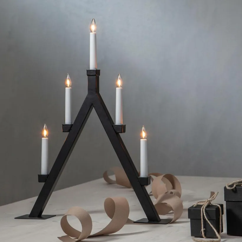 Oliver är en adventsljusstake i metall. 5 ljuskällor lyser stämningsfullt och skapar en fin julstämning i hemmet eller i den offentliga miljö. Ljuskällan är en led lampa med soft glow filament. Lampans effekt 0,5 W.