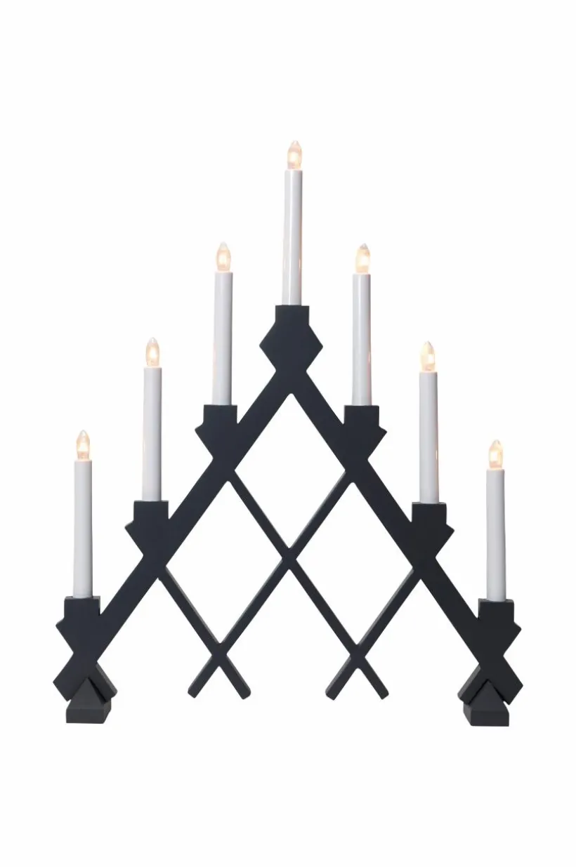Vacker träljusstake i en fin grå färg. Ljusstakens vackra rut-mönster är iögonfallande. Med sina 7 ljuskällor skapar den en mysig belysning. Höjd 53 cm, bredd 43 cm, djup 7 cm. Sockel E10. Sladdlängd 180 cm.