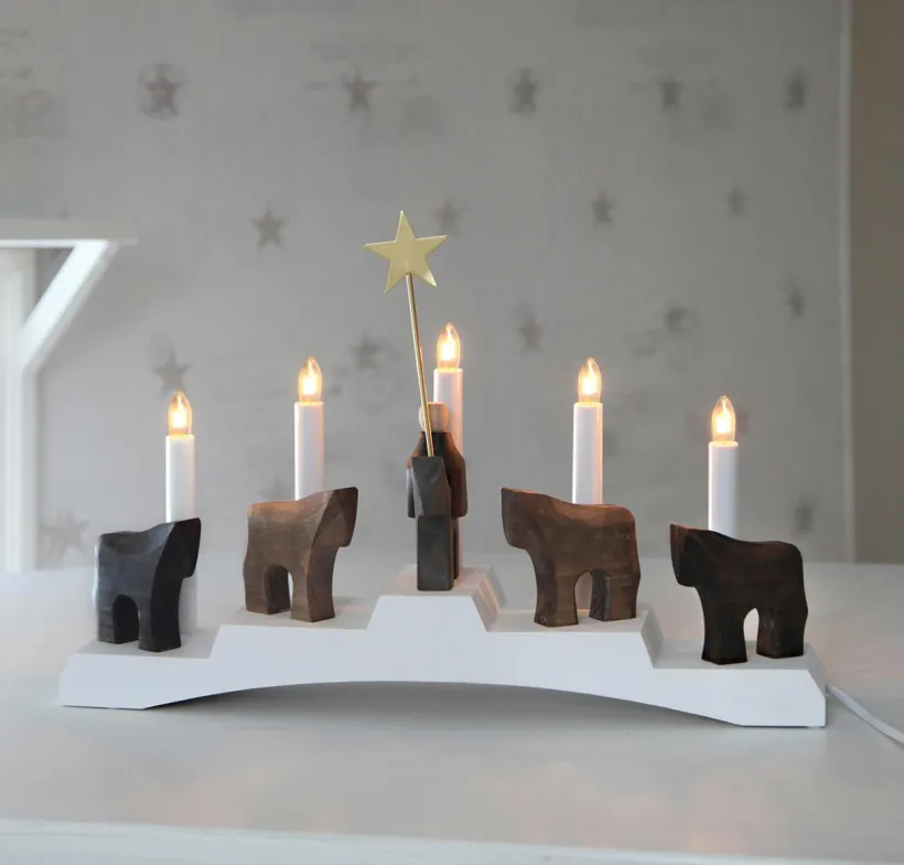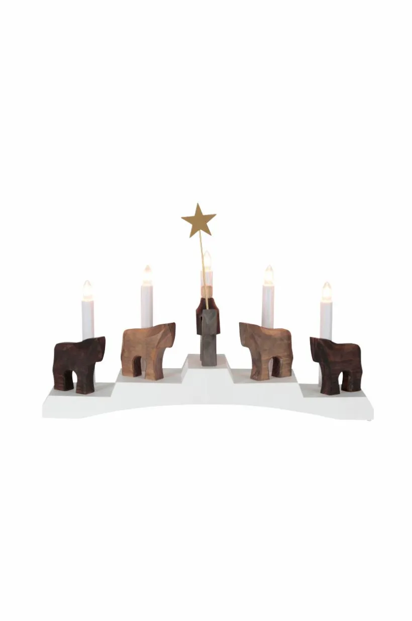 Häftig ljusstake med fina detaljer som gör sig bra på ett bord eller i ett fönster. Ljusstaken är vit och har detaljer i olika trä färger.Bredd 45, höjd 29 djup 11 cm. 5 ljuskällor, 1,8 m sladd med strömbrytare.
