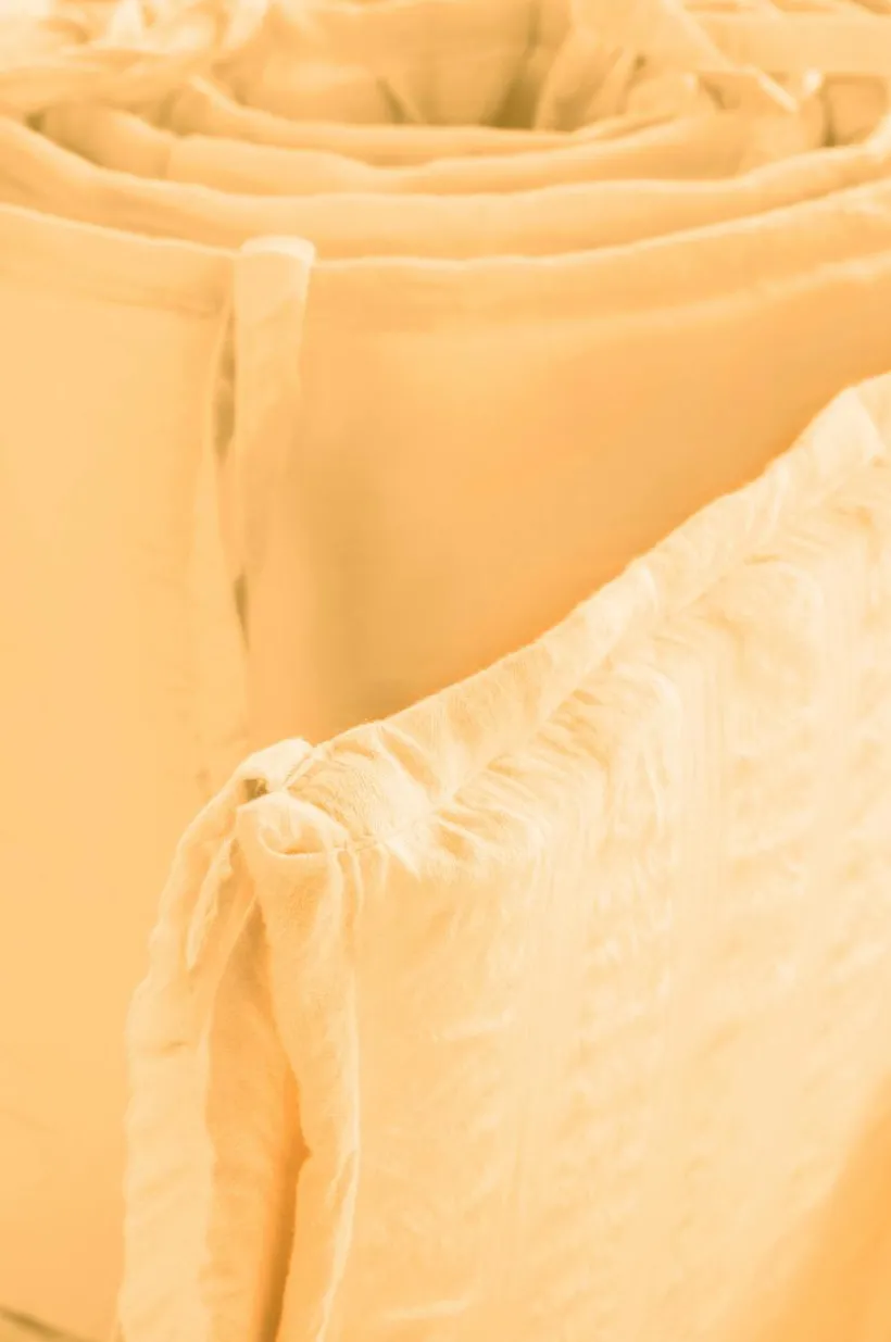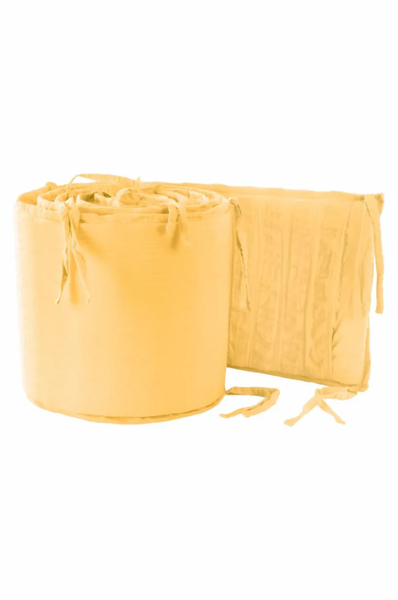 Spjälsängsskydd med yttertyg i skön bäckebölja av certifierad, ekologisk bomull. Bäckebölja är en luftig kvalité och det bubbliga tyget känns svalt och andas behagligt. Serien LOLO är enfärgad och samtidigt randig, slättvävt tyg varvas med ränder i bäckebölja. Tyget är garnfärgat och tvättat för att få en mjukare känsla. Fyllning av polyuretan med mjuk skumgummikärna. Spjälskyddet gör spjälsängen mer ombonad och mysig, samtidigt som det hindrar barnet från att slå emot spjälorna i sömnen. Spjälsängsskyddet knyts fast med knytband. Yttertyget är avtagbart och tvättbart. Tygets gramvikt 225 g/m².