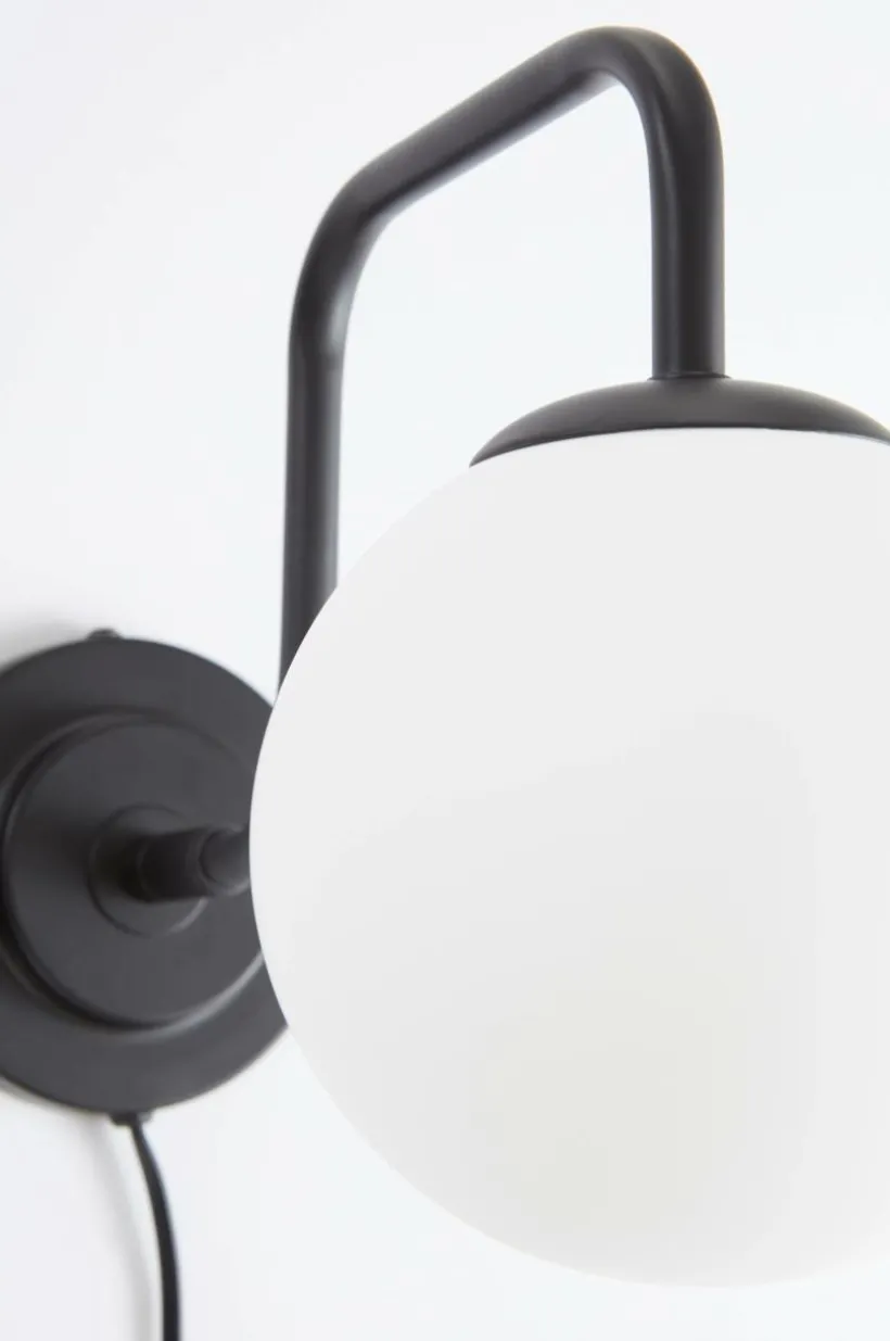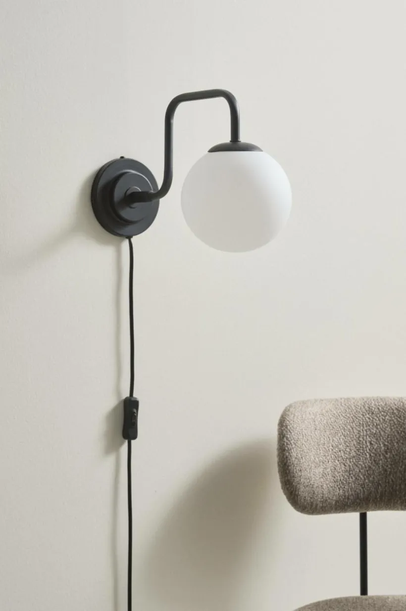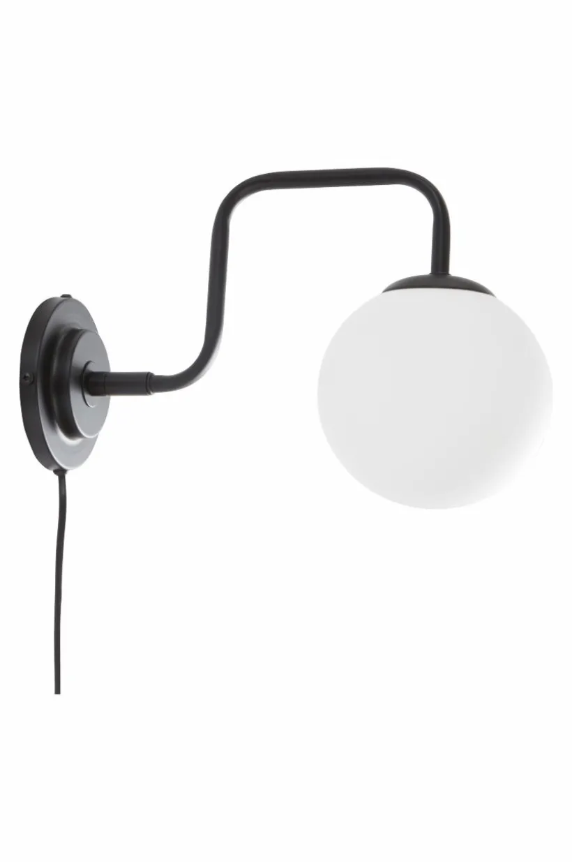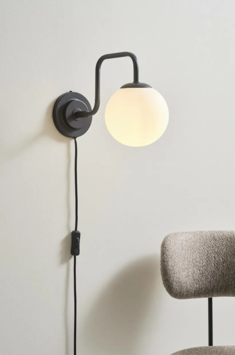 Vägglampa av metall med rund kupa av opalglas. Det snyggt formade fästet ger lampan skön karaktär och den är en trevlig blandning av modernt och gammaldags. Lampan kan monteras uppåt- eller nedåtvänd vilket ger lampan olika uttryck. Lampan är snygg både i hallen bredvid spegeln eller varför inte som skrivbordslampa eller sänglampa över sängbordet? Sladden är transparent och strömbrytaren sitter på sladden.