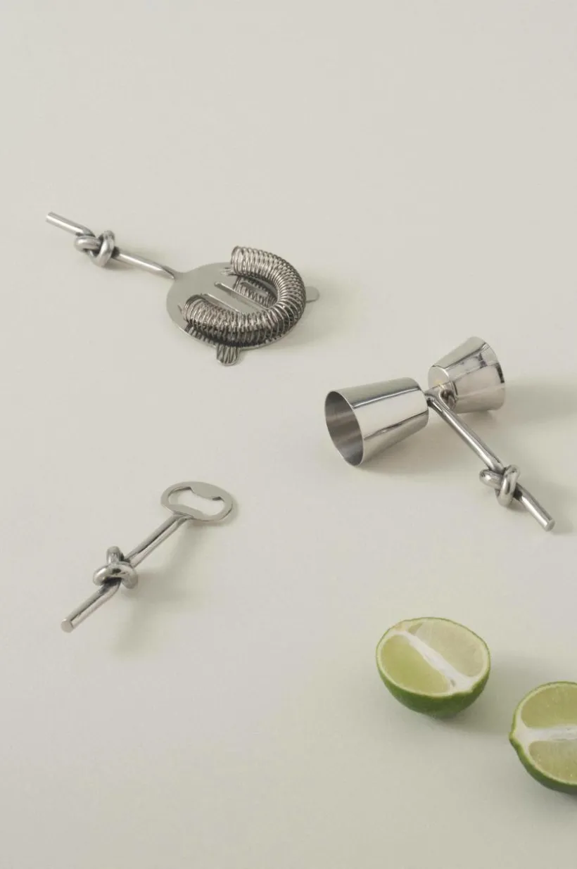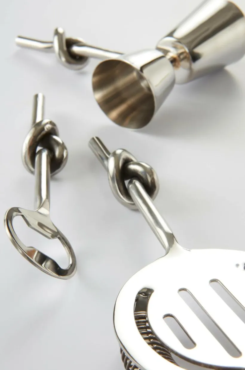 Drinkset i 3 delar av rostfritt stål, perfekt när du bjudit in vänner till fest. LOOP har rustik design med knut på skaftet. Setet innehåller en kapsylöppnare, en sil och ett mätglas med två mått.