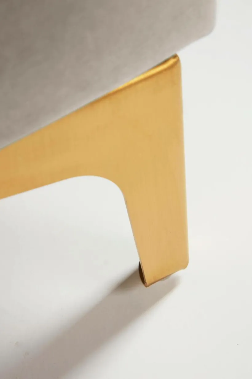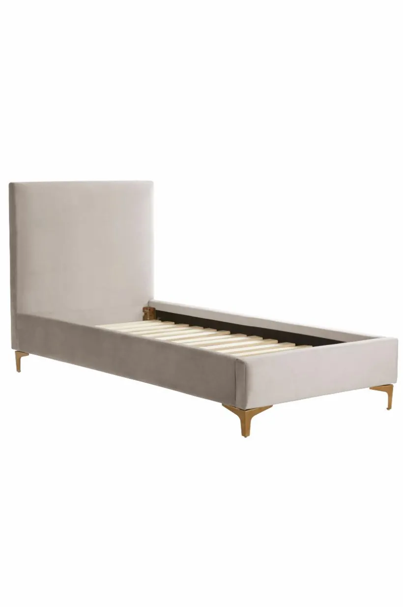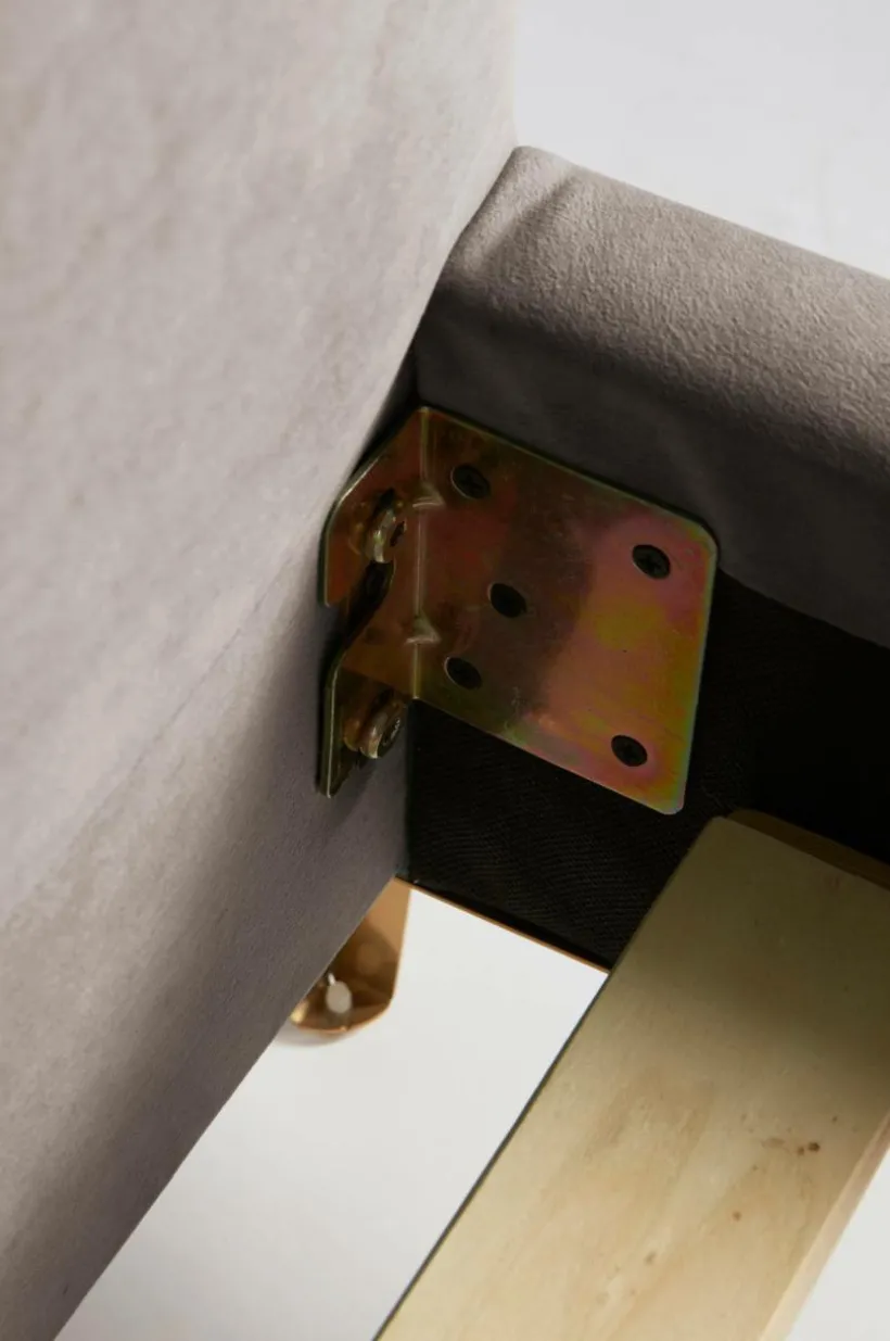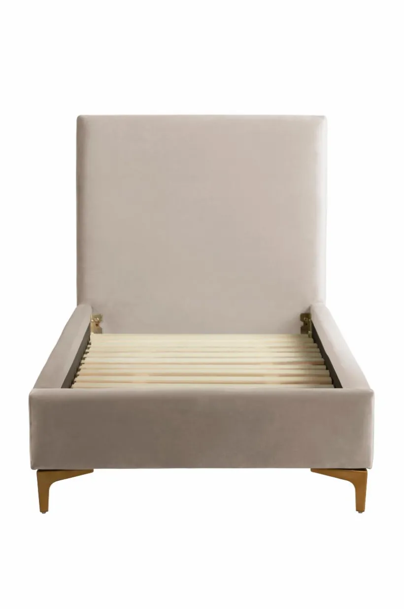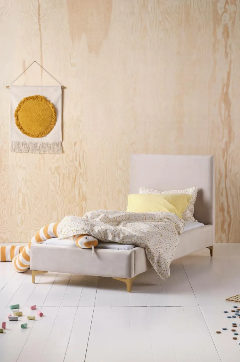 Barnsäng med stoppad gavel klädd i sammet och stilrena mässingben. En perfekt andra säng efter det att barnet har vuxit ur spjälsängen. Tygets slitstyrka är på 28000 Martindale. Används med madrass i storleken 70×160 cm. Madrass ingår ej. Viss montering krävs. Monteringsanvisning medföljer.