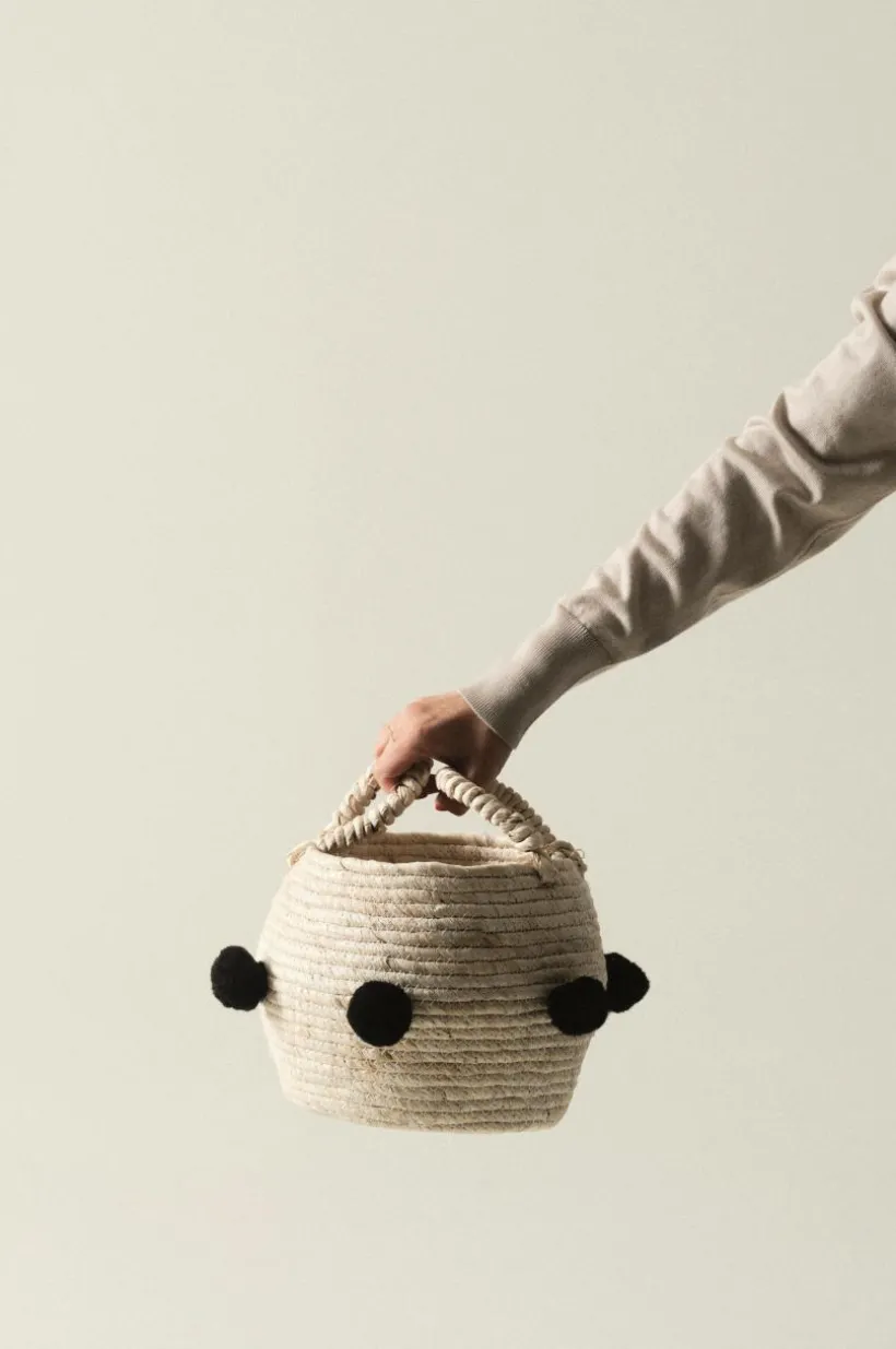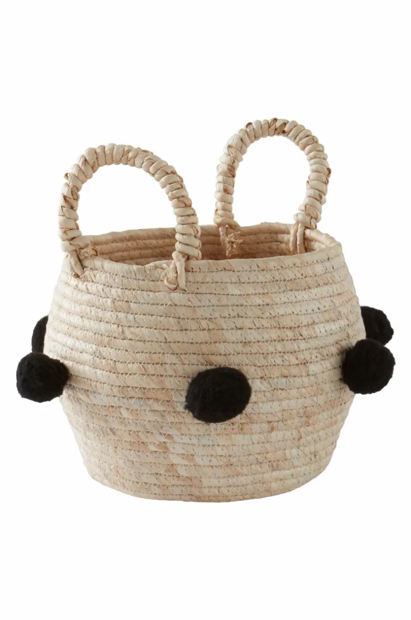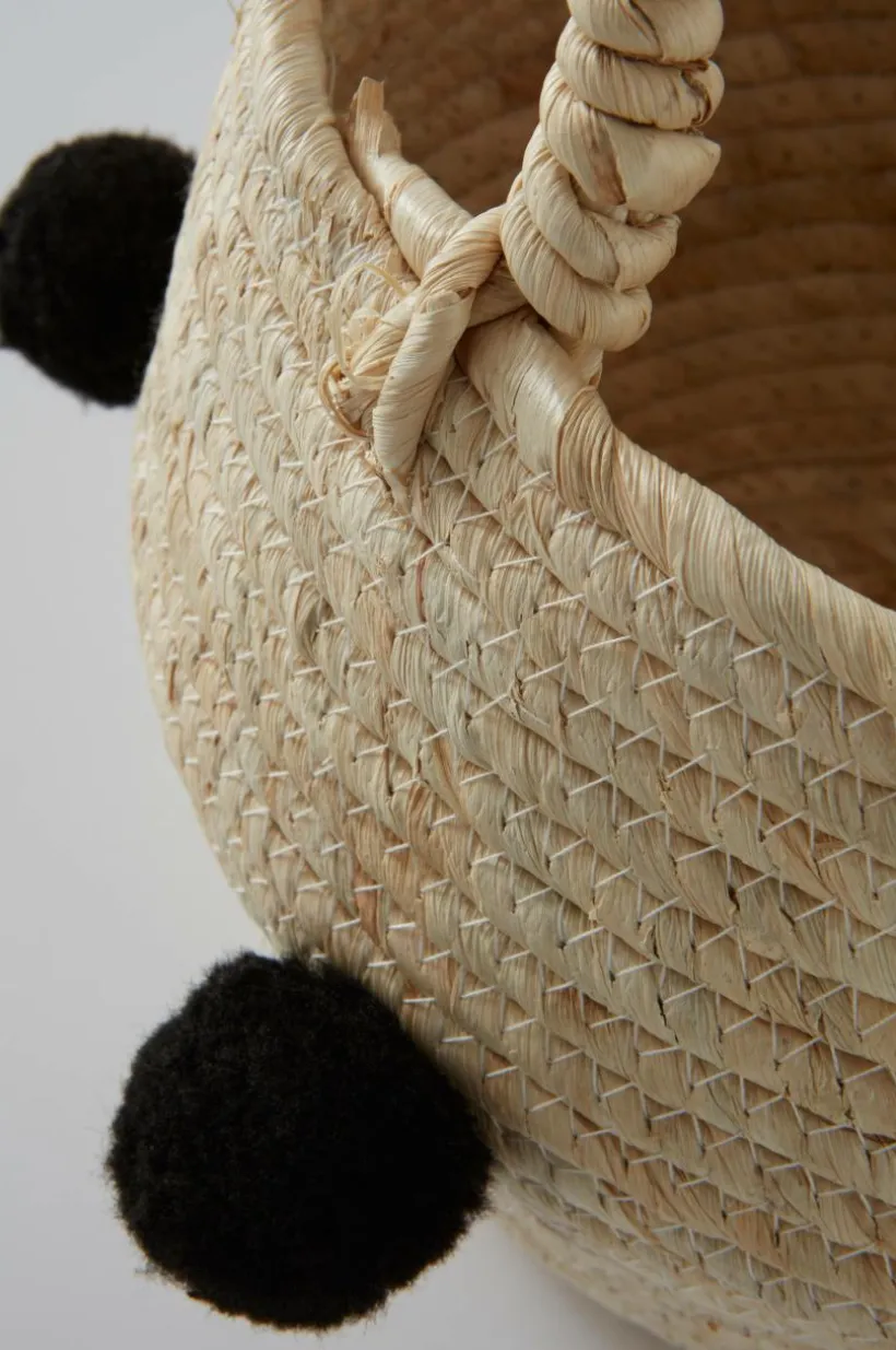 Förvaringskorg flätad i rep som producerats av skalet runt majskolven. Det blir ett slitstarkt rep att fläta med. Korgen har dekorerats med sex bollar som sitter runt om det bredaste stället. Korgen har två praktiska handtag. Hantverket och det naturliga materialet gör varje korg är unik.