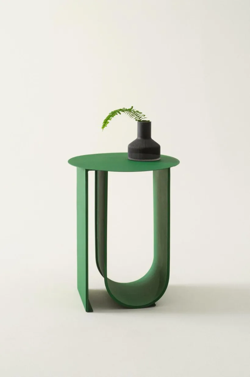 LOSTALLO är ett speciellt sidobord av järn med pulverlackerad yta med lite struktur. Bordet har ett underrede som sticker ut och kommer att få uppmärksamhet där du placerar det.