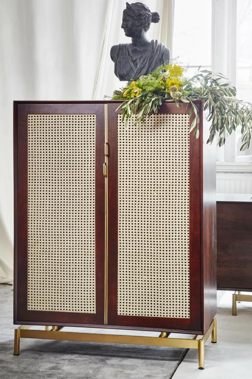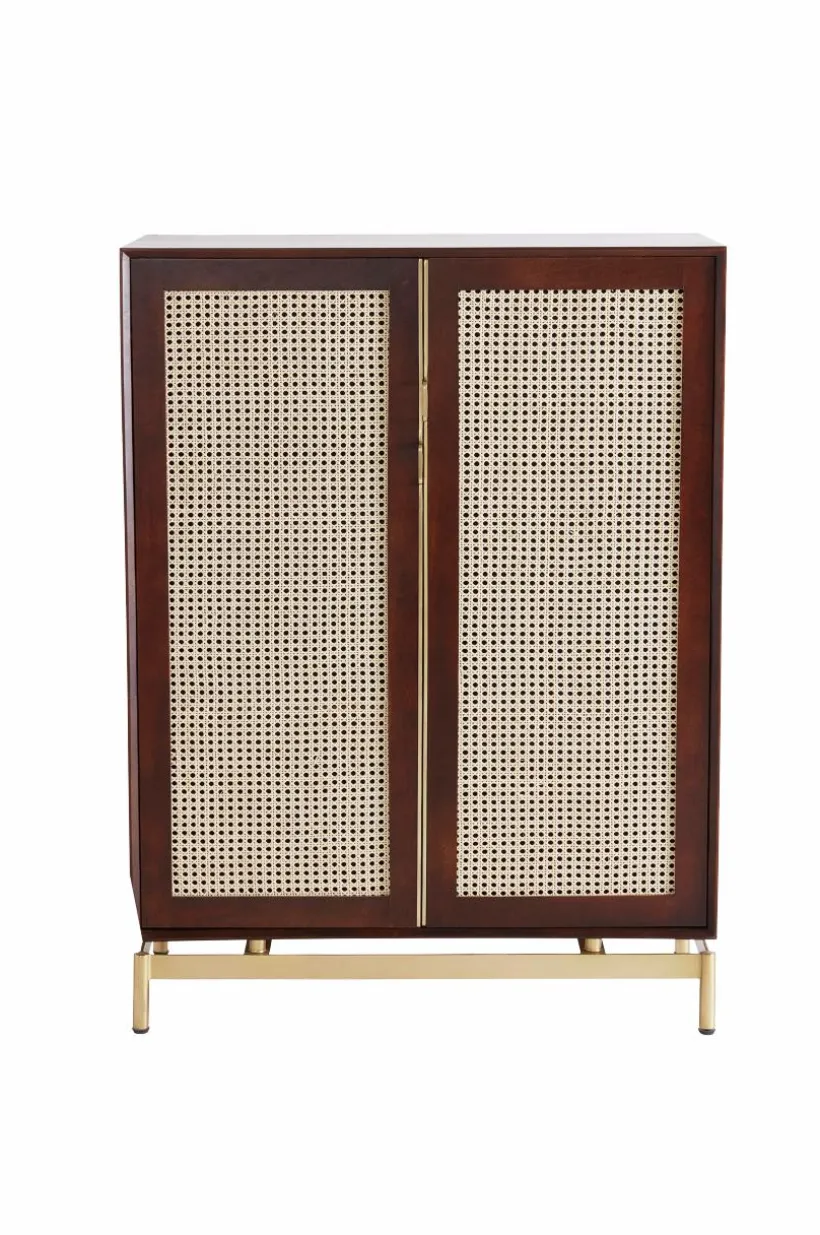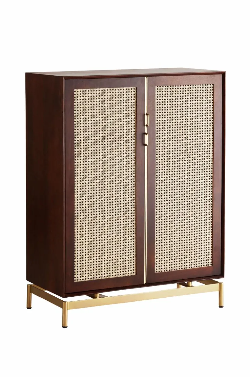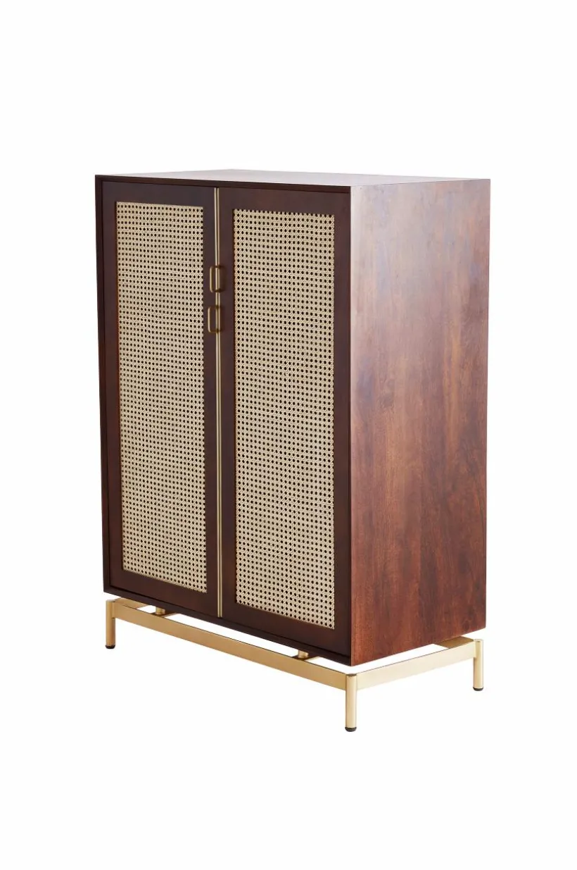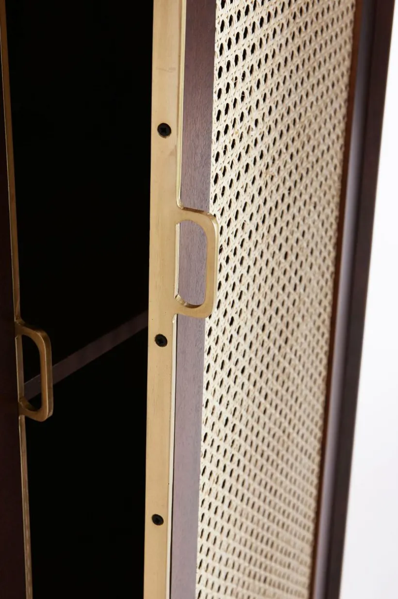 Beskrivning: Skåp i mangoträ med mahognyfinish. Dörrarna har rotting (av sockerrör) i ramen. Fasta hyllor i skåpet. Ben och beslag i guldfärgad metall.
