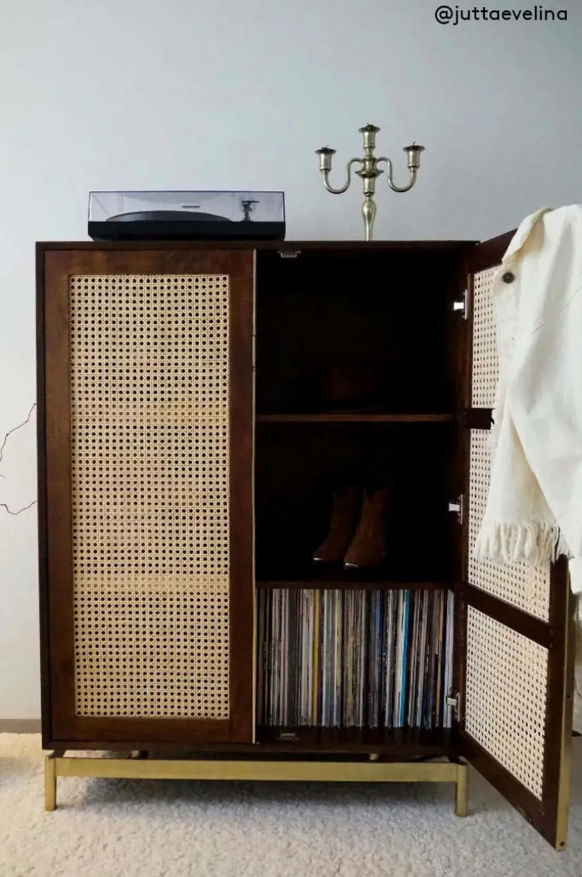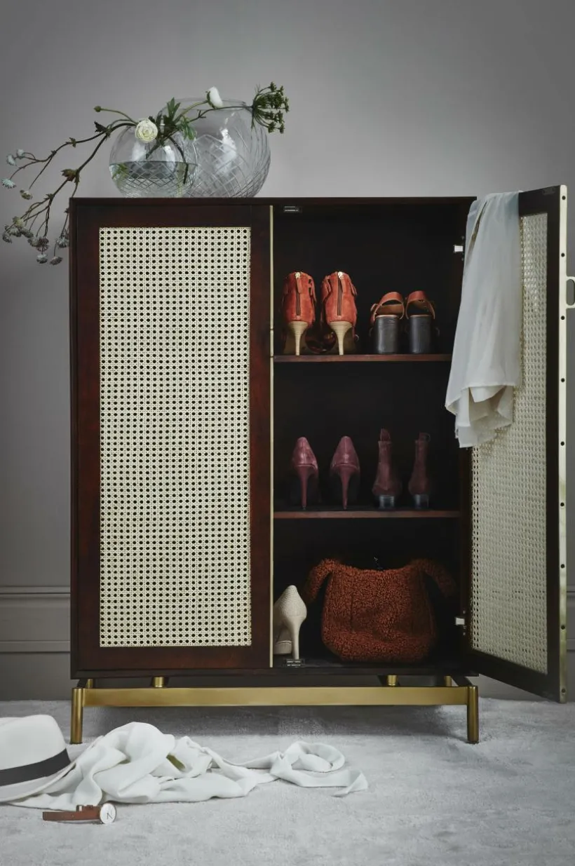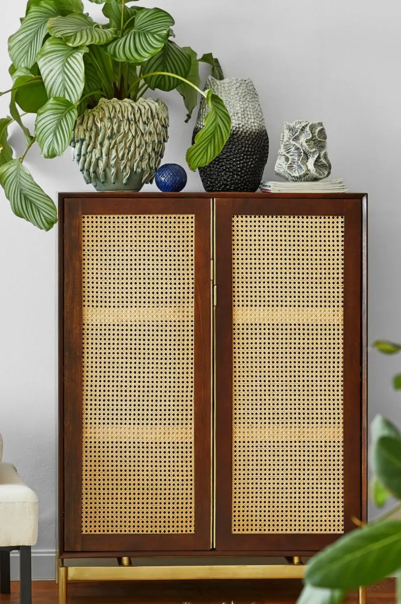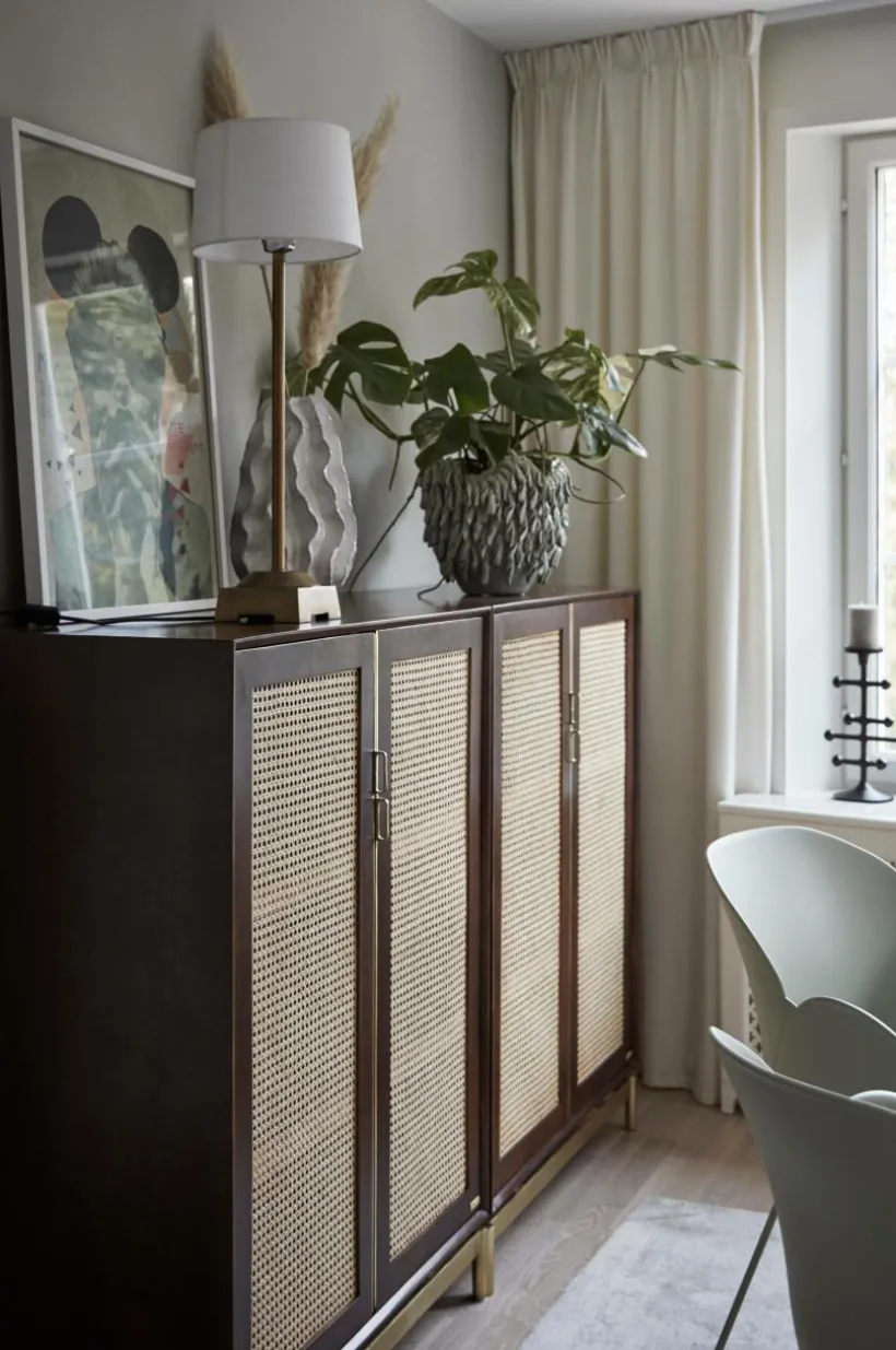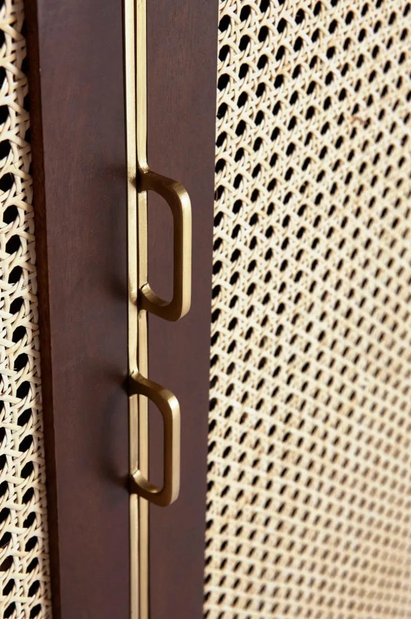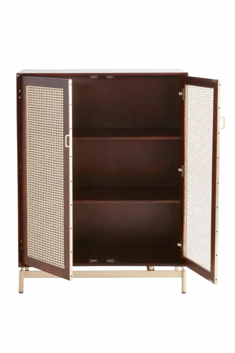 Beskrivning: Skåp i mangoträ med mahognyfinish. Dörrarna har rotting (av sockerrör) i ramen. Fasta hyllor i skåpet. Ben och beslag i guldfärgad metall.