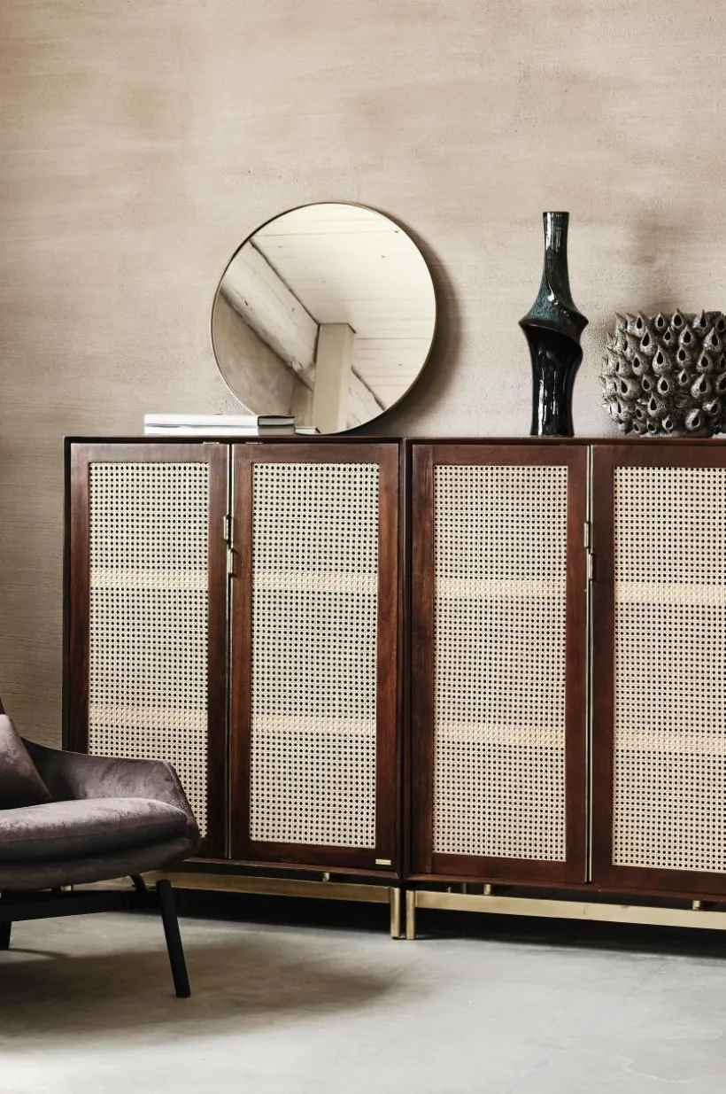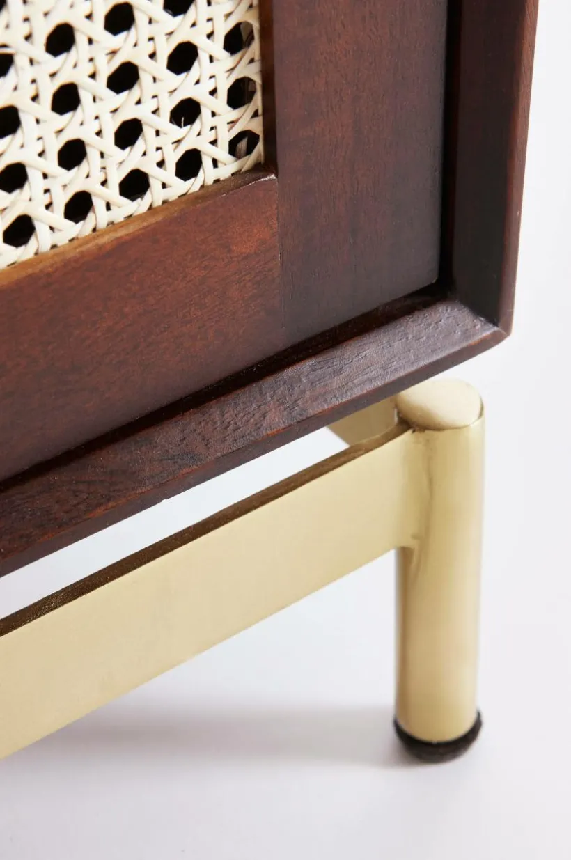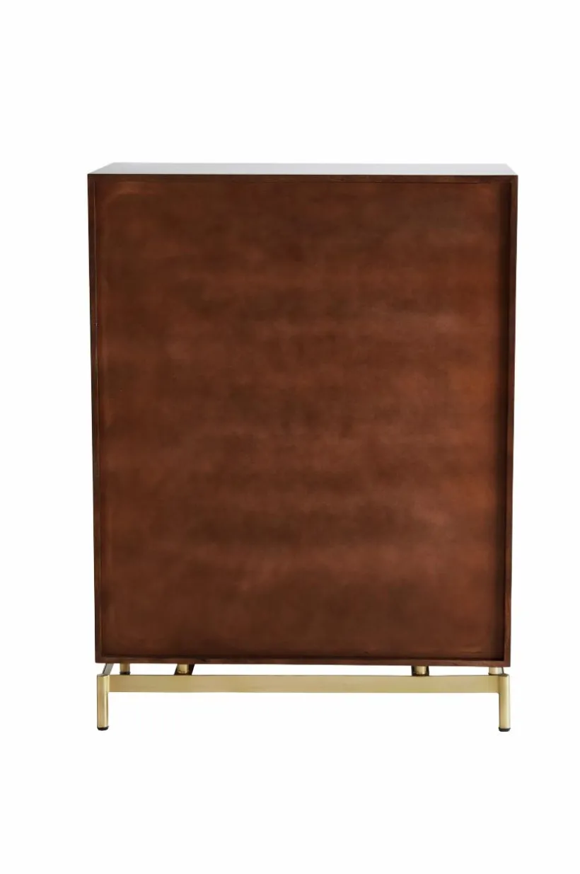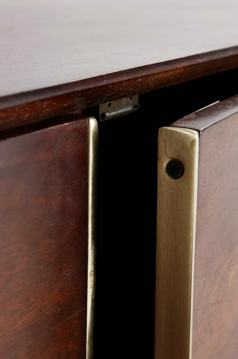Mahognyfärgat skåp med detaljer som ger en helrätt retrokänsla och tanken går till 60-talet. Dörrarna har nätta, guldfärgade metallbeslag som matchar benen.