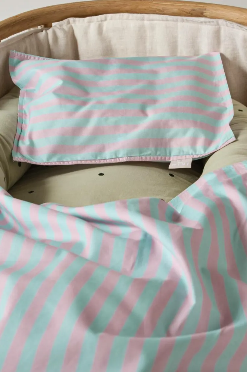 1-pack randigt örngott av ekologisk bomull. Sängkläderna i serien LOUSA är färgstarka och ränderna är digitaltryckta, vilket ger ett mjukare och mer distinkt tryck med klarare färgåtergivning. Ekologisk bomull är skönt att sova i, svalt och mjukt mot huden. Detta örngott passar bra att ha under det lilla barnets huvud när det sover, enkelt att tvätta oftare än hela lakanet. Trådtäthet på 180 tc. (Trådtätheten talar om antalet trådar, thread counts, per kvadrattum i ett tyg. Ju högre trådtäthet desto högre kvalité. Med undantag för linne som ofta vävs glesare för att få den rätta känslan.)